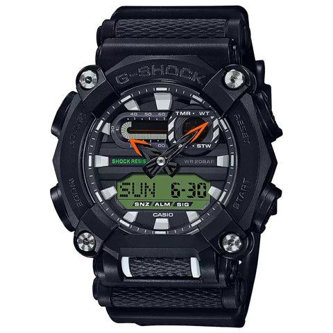 The CASIO G-Shock GA-900E-1A3DR features a rugged design with a striking black and orange color scheme. Its robust build includes shock resistance and 200-meter water resistance, making it ideal for both daily wear and extreme conditions. The LED backlight and luminous markers ensure readability in low-light environments.