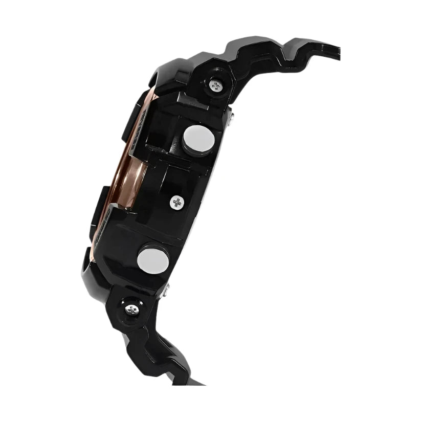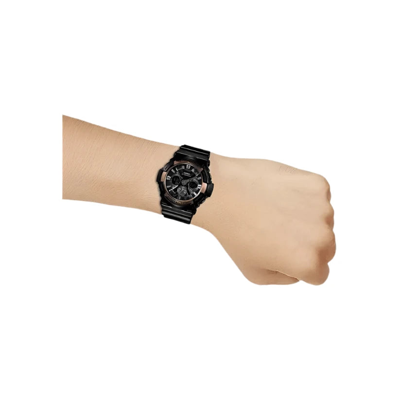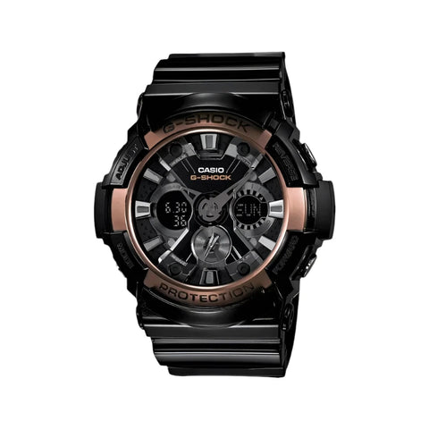 Discover the Casio G-SHOCK G402 GA-200RG-1ADR, a striking analog-digital watch designed for men who appreciate both style and functionality. Featuring a bold black resin case with rose gold accents, this timepiece combines durability with a modern aesthetic. The watch is equipped with G-SHOCK's renowned shock resistance, ensuring it withstands the rigors of everyday wear