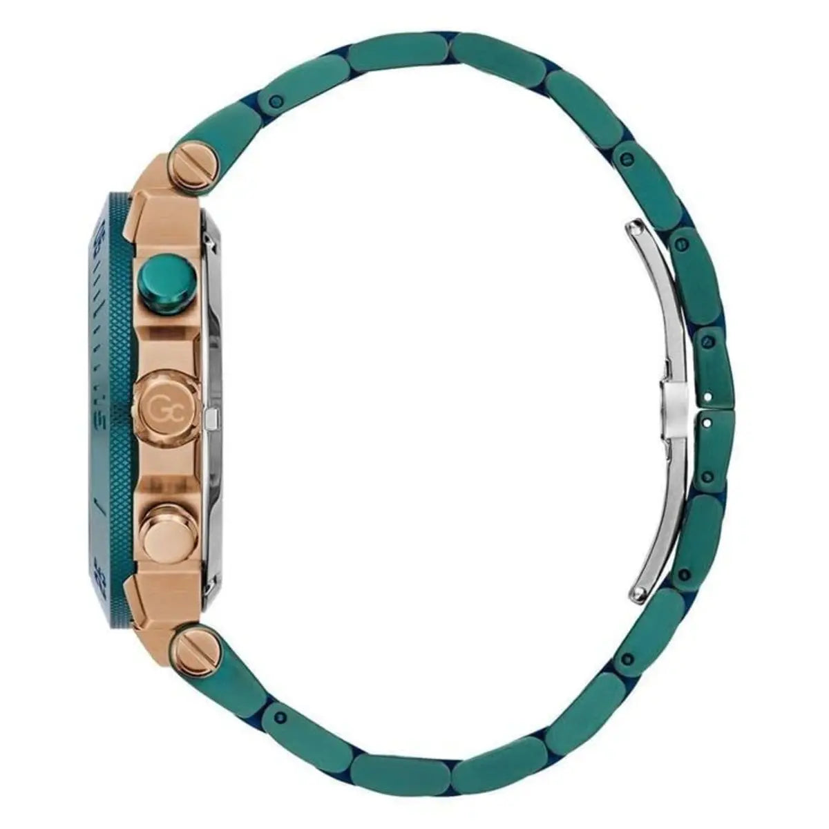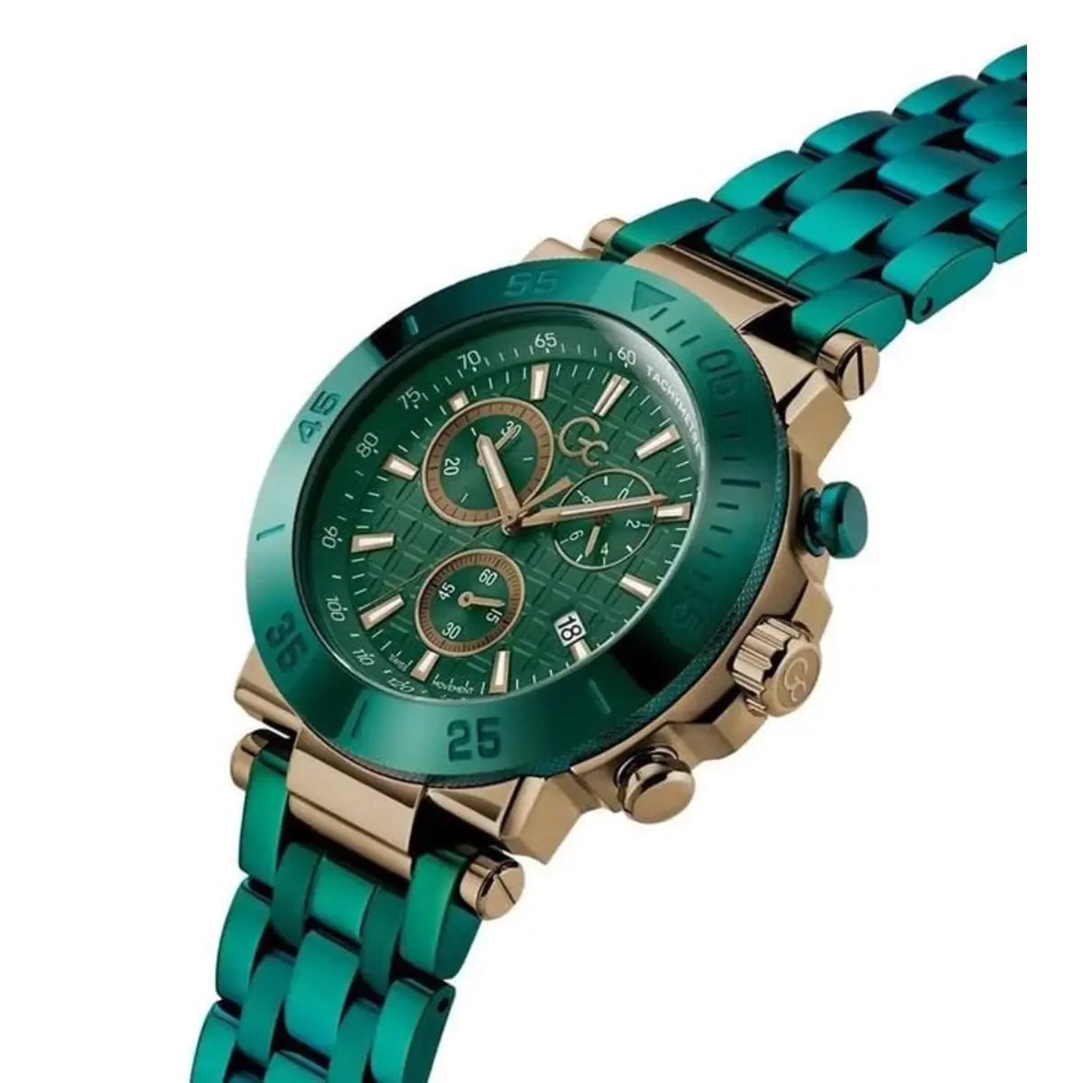 Elevate your everyday style with a bold statement piece from the ONE collection by Gc. This men's analog watch boasts a striking green dial housed in a robust 44 mm stainless steel case, powered by precise quartz movement for reliable timekeeping. Designed with a chronograph function, it seamlessly blends performance and aesthetics. The matching green stainless steel strap adds a modern edge, while the secure deployment clasp with push-button closure ensures all-day comfort and confidence. Distinctive and dynamic, this timepiece is perfect for the man who values both style and substance.
