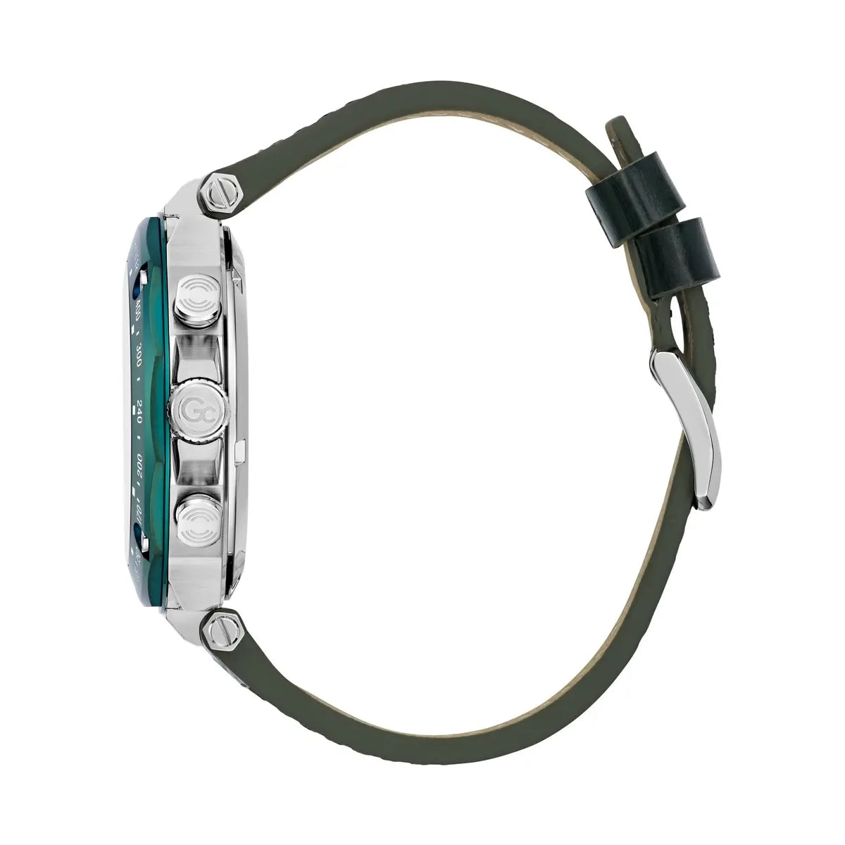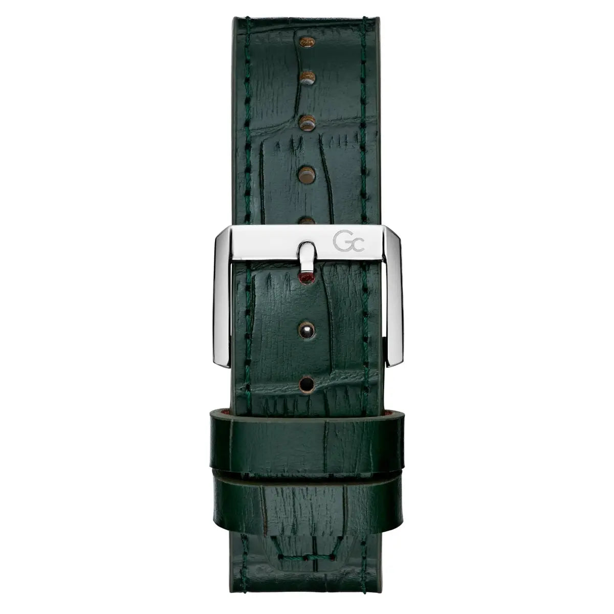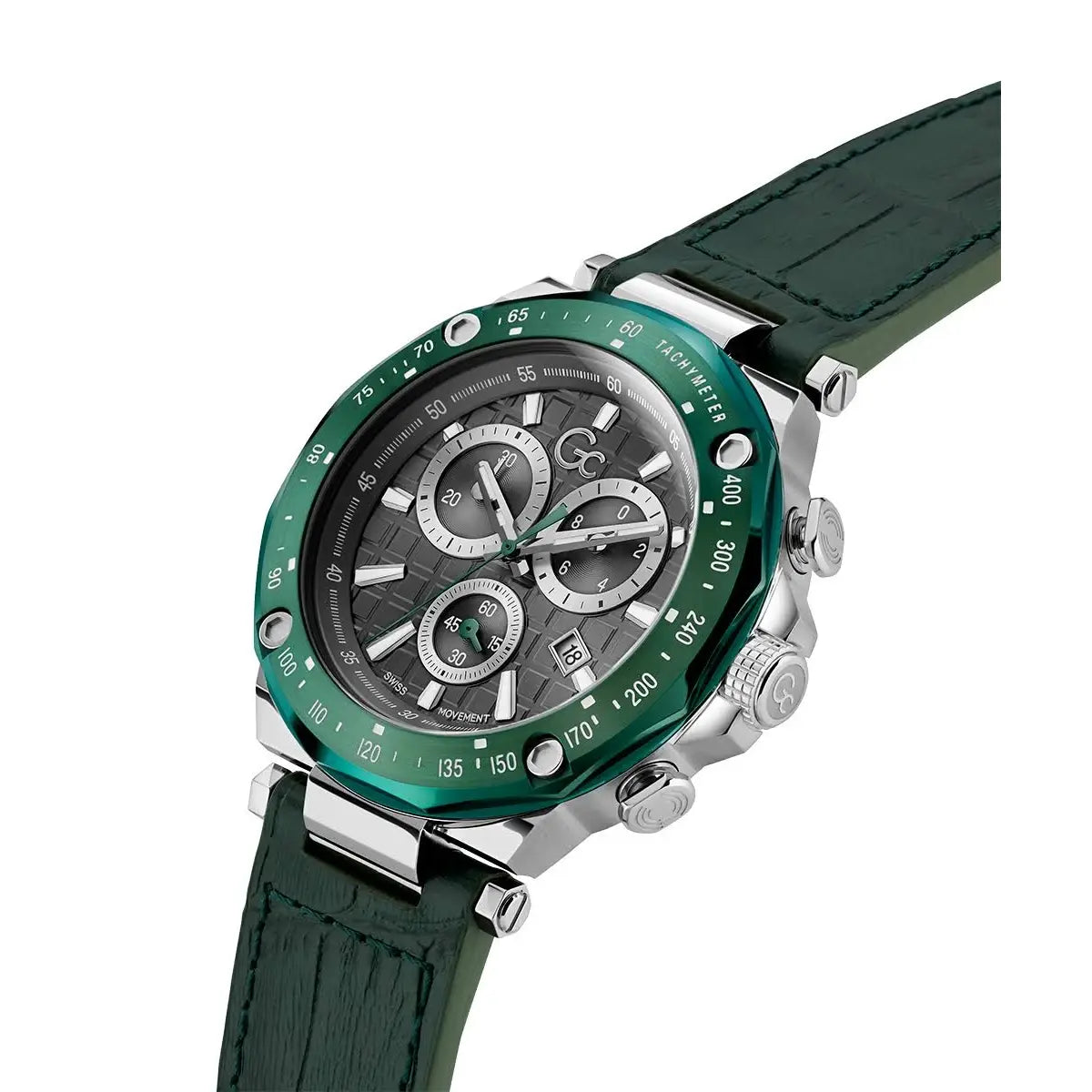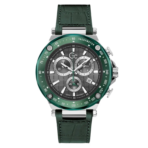 Command attention with refined confidence by sporting this men's analog timepiece from the Spirit Sport collection by Gc. Crafted for those who blend boldness with sophistication, it features a sleek grey round dial encased in a robust 45 mm case and safeguarded by durable mineral glass. The integrated chronograph function enhances both its utility and dynamic aesthetic. Complementing the design is a textured green leather strap that adds a vibrant contrast and a modern edge. Finished with a classic buckle clasp, this watch ensures a secure and comfortable fit—making it a perfect partner for both casual and smart attire.
