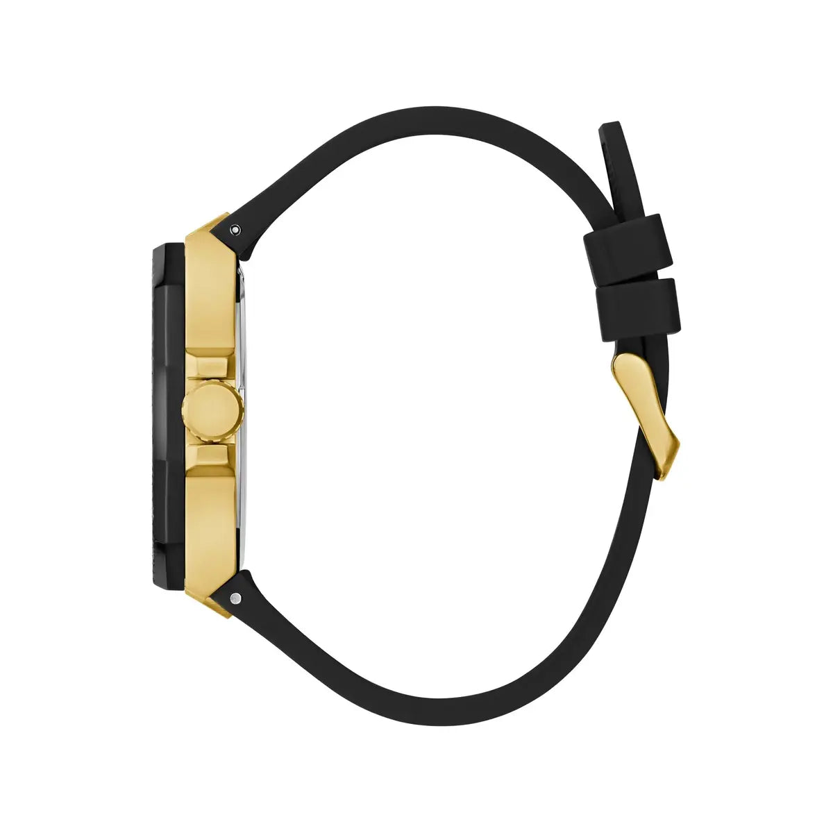 Engineered for everyday edge, the GUESS Indy men's analog watch blends rugged appeal with modern minimalism. Encased in a bold 45 mm frame, its black round dial features clean three-hand movement and is safeguarded by durable mineral glass. The sleek black silicone strap adds a sporty, comfortable touch that pairs effortlessly with casual or active wear. Finished with a secure buckle clasp and powered by reliable quartz movement, this timepiece is a go-to accessory for the man who appreciates subtle strength in his style.