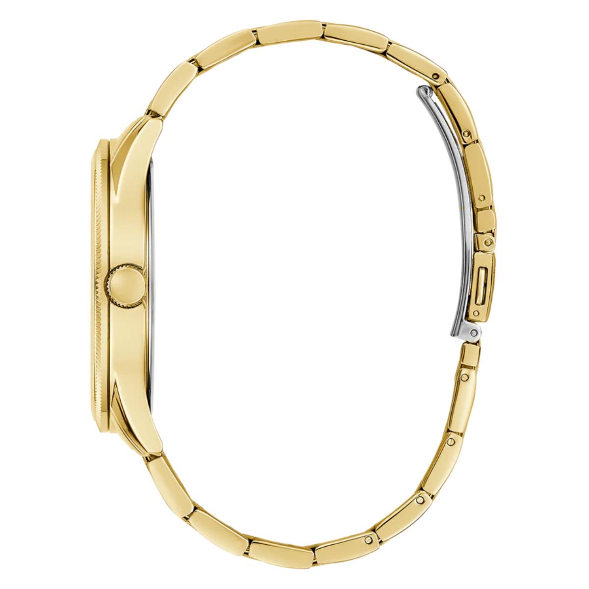 Discover refined style with this Guess men’s watch, crafted with a striking green dial and a luxurious gold stainless-steel strap. Designed in a classic round case, it blends timeless elegance with modern durability. The mineral glass and stainless-steel body ensure lasting clarity and strength, while the balanced 44 mm case size, 20 mm strap width, and sleek 10 mm profile provide comfortable everyday wear. Powered by reliable quartz movement with a clean analog display, it offers 3 ATM water resistance and a secure pilot buckle for a confident and dependable fit.