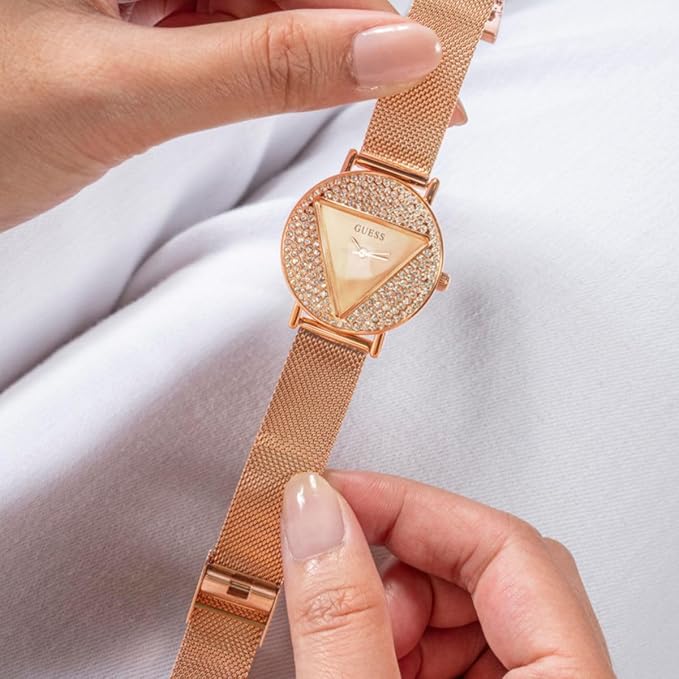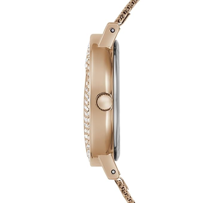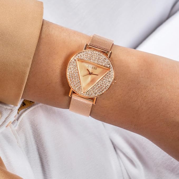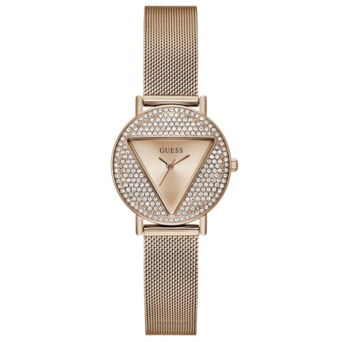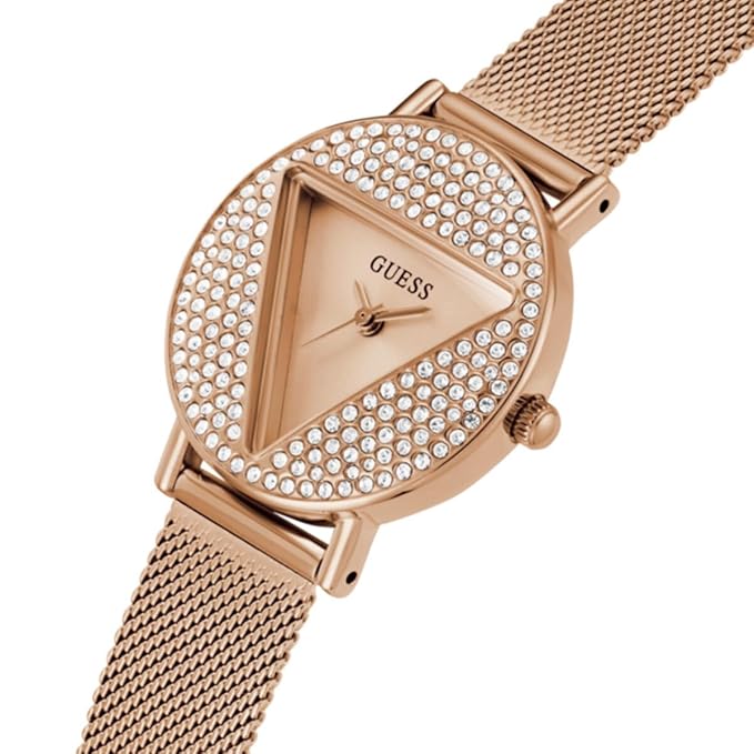 Add a refined edge to your look with this stunning women’s analog watch from GUESS — a statement piece that blends sophistication with everyday style. Featuring a radiant rose gold round dial encased in durable mineral glass, this timepiece delivers both elegance and durability. The sleek stainless steel strap, also in a matching rose gold finish, enhances its luxurious appeal. Powered by reliable quartz movement and designed with a crown for easy time adjustment, it secures comfortably on the wrist with a stylish hook buckle clasp. Whether for work or weekend, this watch is the perfect fusion of form and function.