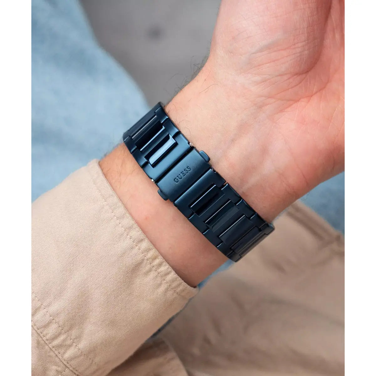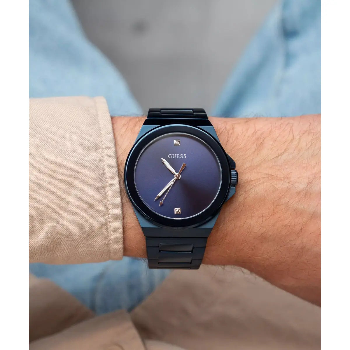 Enhance your style with this striking men’s analog watch from Guess. Featuring a captivating blue round dial, this timepiece is protected by durable mineral glass for added resilience. The sleek crown allows for precise time adjustments, while the stainless steel strap, adorned with a sophisticated blue hue, perfectly complements the overall design. Finished with a fold-over clasp and double push-button safety feature, this watch ensures a secure and comfortable fit on your wrist, making it the perfect accessory for any occasion.