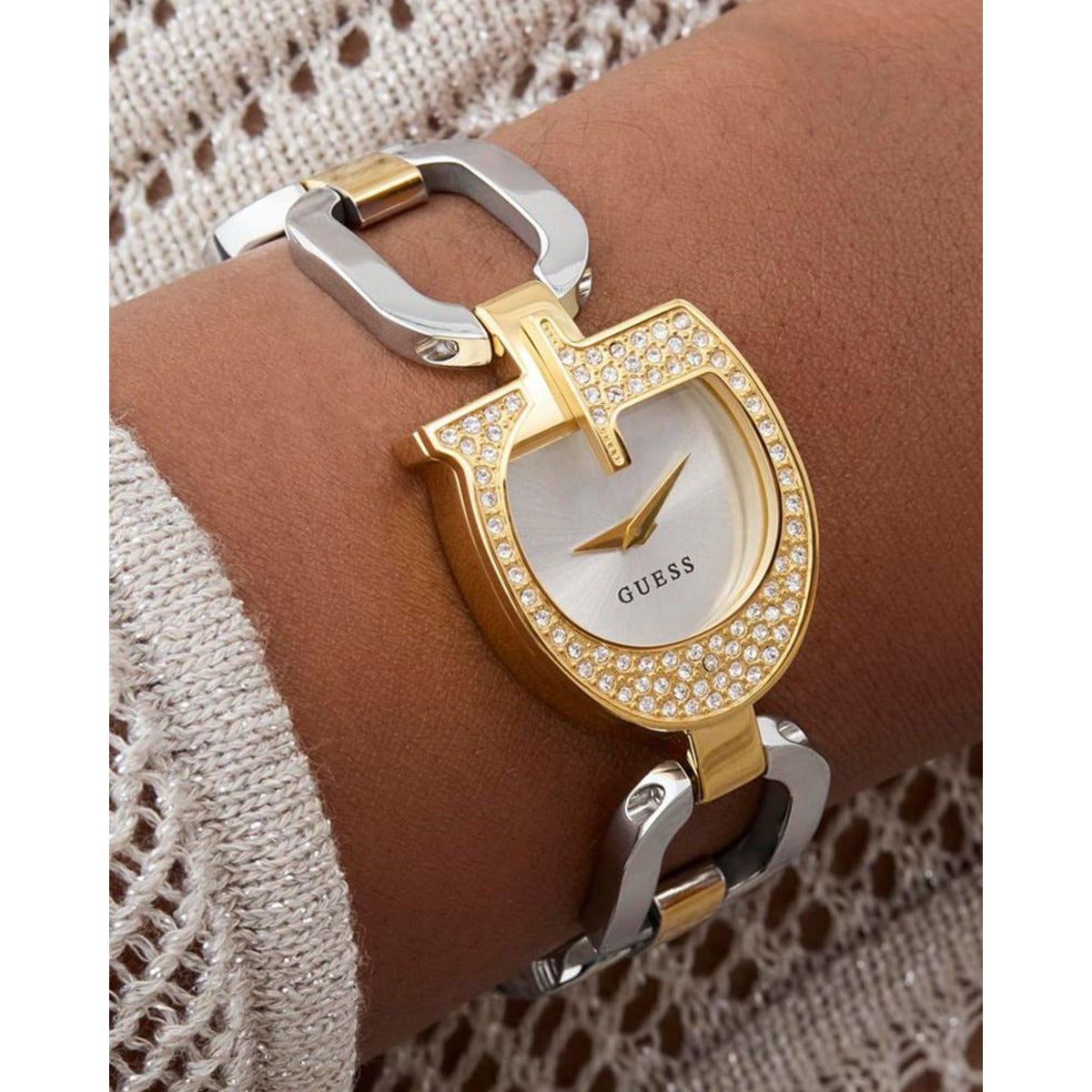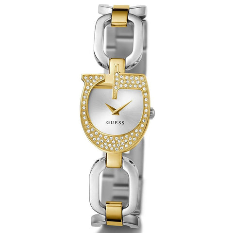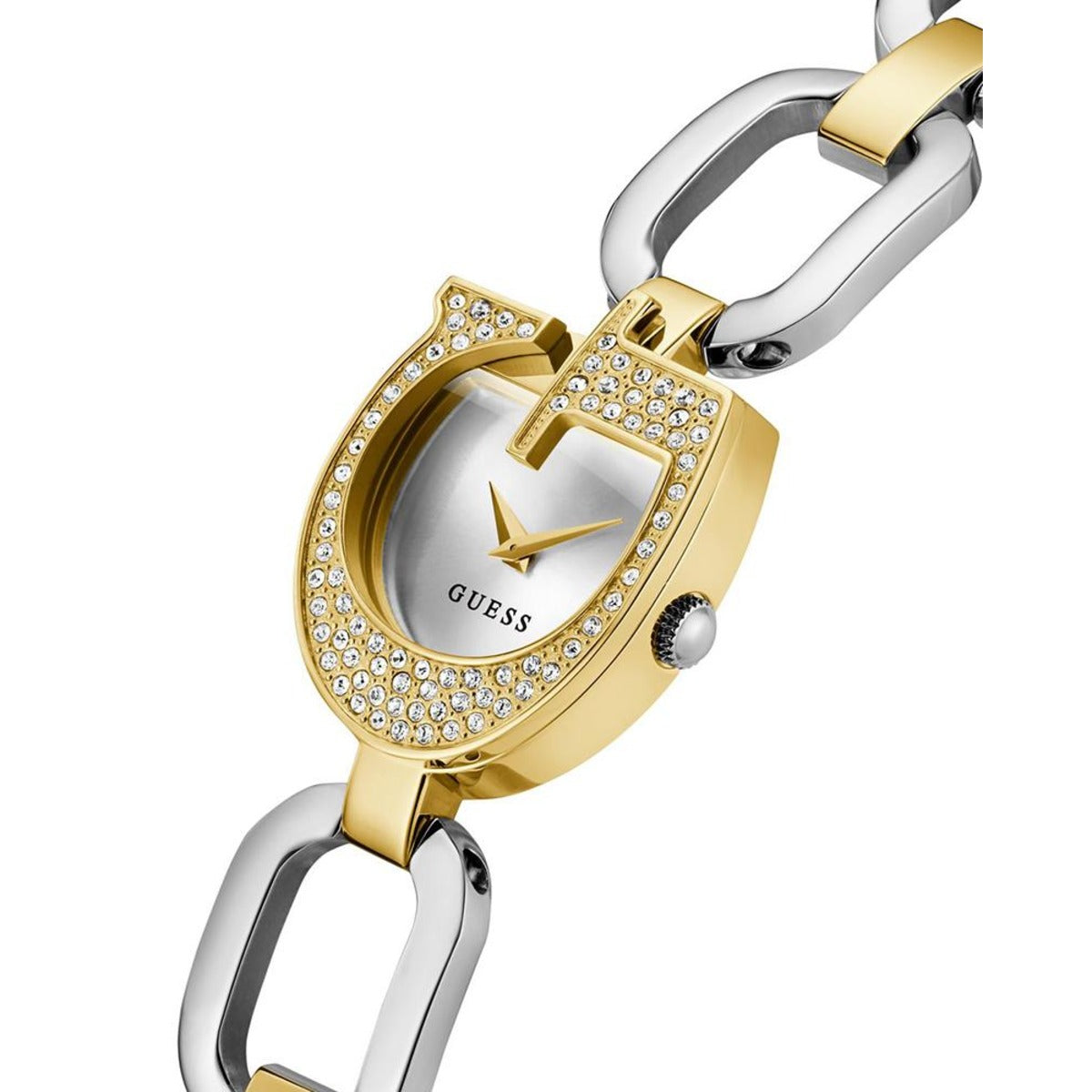 Exude timeless elegance with this women's analog watch from the iconic Gia collection by Guess. Showcasing a distinctive silver asymmetrical dial housed in a sleek 22.2 mm case, this watch is a striking blend of bold design and refined detail. Powered by precise quartz movement and protected by durable mineral glass, it delivers both style and reliability. The sophisticated two-tone stainless steel strap adds a modern touch, while the jewellery clasp offers a secure and graceful fit—making it the perfect statement accessory for any occasion."
