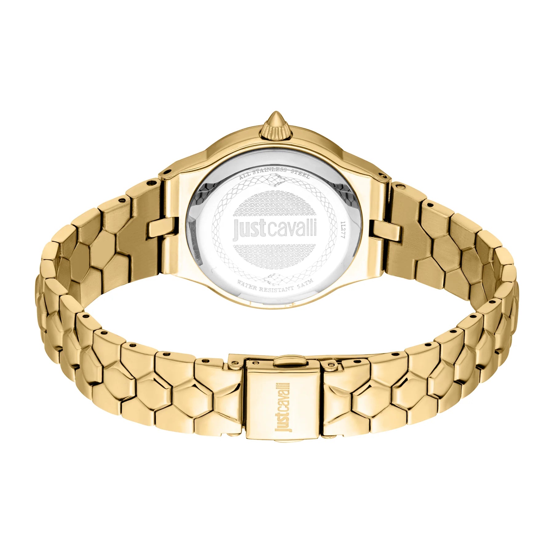 Blending practicality with contemporary elegance, this women's analog watch from Just Cavalli's Stilo collection is a must-have for any fashion-forward woman. The watch features a stainless steel strap in a luxurious gold hue, elevating its overall design. Protected by durable mineral glass, the silver round dial sits perfectly within a 32mm case, showcasing a sleek analog movement. Designed for comfort and security, the watch is finished with a push-button clasp, ensuring a snug and reliable fit on the wrist. This timepiece seamlessly combines style and function, making it a standout accessory for any occasion.