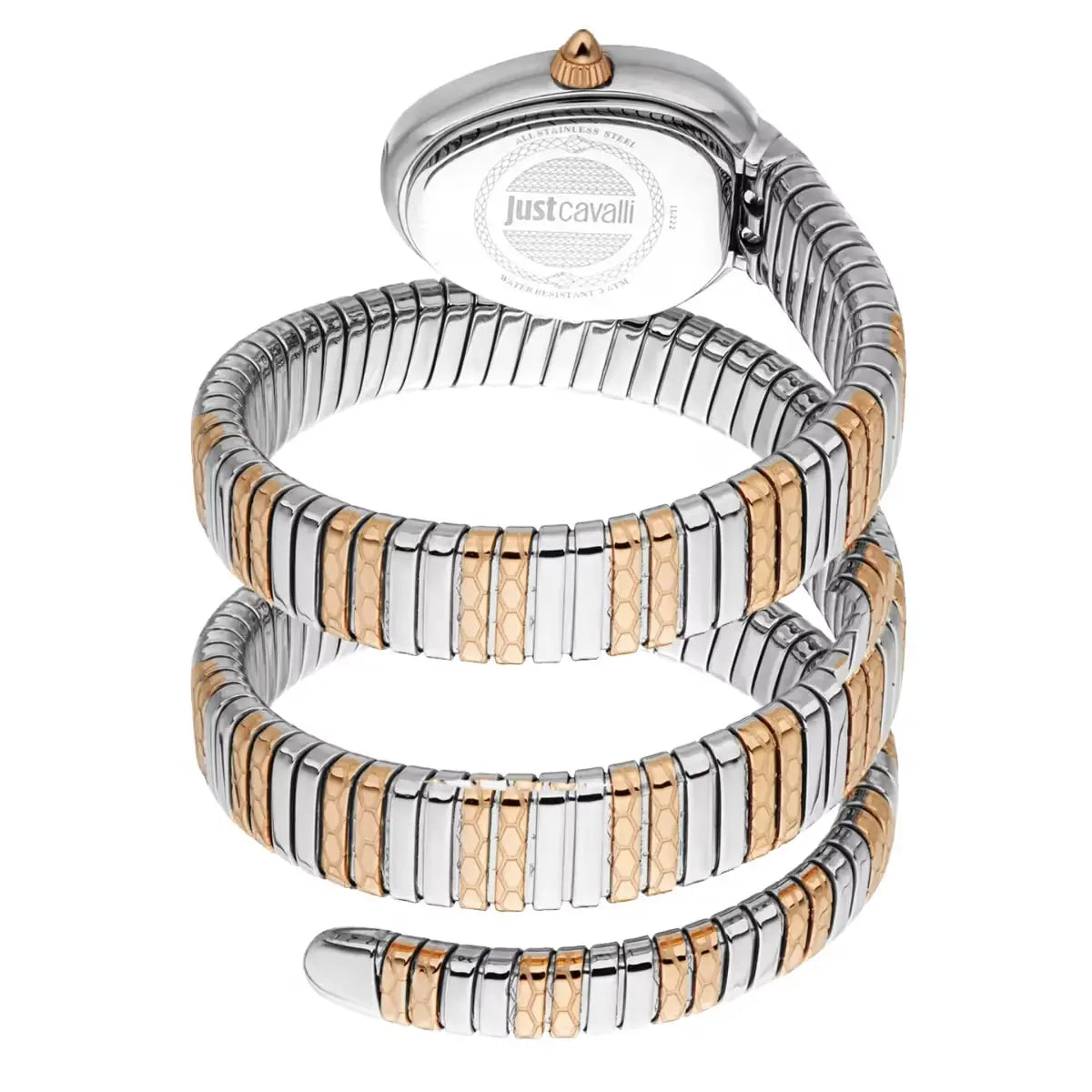 Capture attention with this exquisite women's analog watch from the exclusive JUST CAVALLI collection. Featuring a striking green asymmetrical dial, safeguarded by durable mineral glass, this timepiece effortlessly blends boldness with elegance. The crown allows for precise time adjustment, ensuring both functionality and style. The stainless steel strap, finished in a sophisticated multihue, adds a vibrant touch that enhances the overall appeal of the watch. To ensure a perfect and secure fit, it is completed with a sleek bangle clasp, making it the ideal accessory for any occasion.