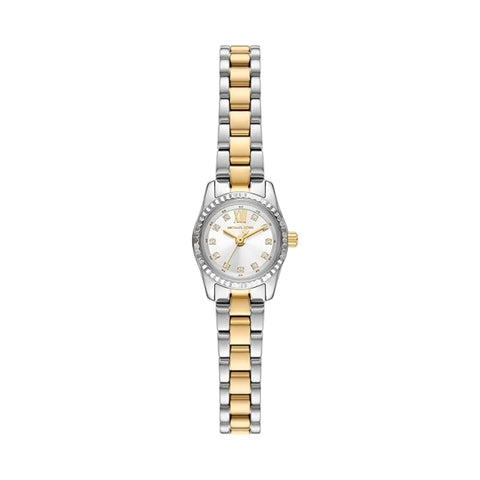Turn heads with the Michael Kors Lexington Mini Watch — a refined blend of timeless style and modern sparkle. Designed in durable stainless steel with an elegant two-tone finish, this petite timepiece features a round dial framed by a beveled topring and dazzling pavé accents that catch the light beautifully. The matching bracelet strap adds a cohesive, polished touch. Whether you're heading to the office or out for the evening, this watch brings effortless sophistication to every look.
