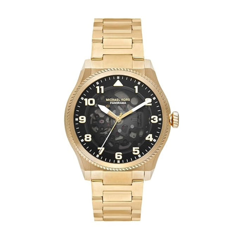 Make a powerful statement with this pilot-inspired Michael Kors timepiece, crafted for those who appreciate precision and presence. The self-winding skeleton automatic movement showcases expert craftsmanship—powered effortlessly by the motion of your wrist, with no battery required. A brushed black dial sits within a bold 44mm gold-tone stainless steel case, striking the perfect balance between rugged durability and refined sophistication. Designed to stand out, this watch is a true centerpiece for any modern collection.