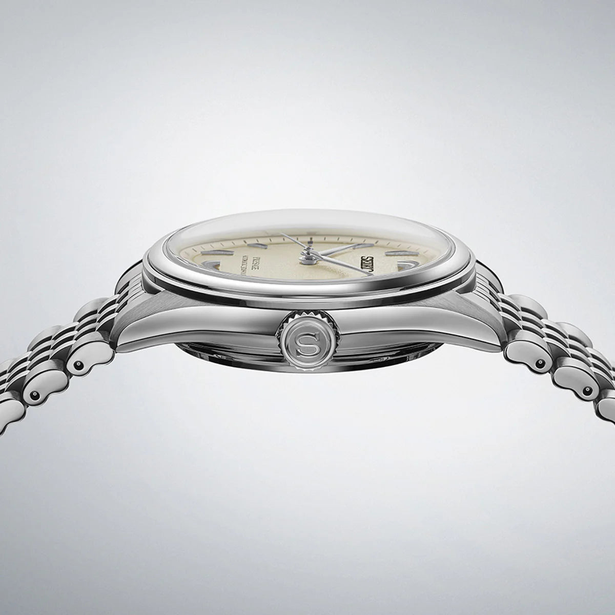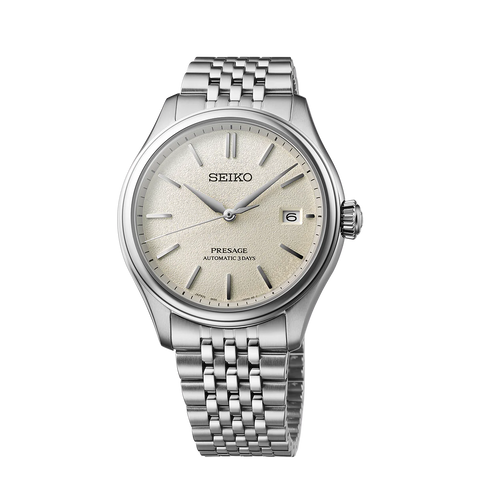 Introducing the Seiko Presage Classic Series – a blend of timeless elegance and Japanese craftsmanship. The ‘Shiro-iro’ model features a warm white silk-inspired dial under curved sapphire glass, evoking vintage charm with its curved hands and indices. Its retro-style, seven-piece bracelet, inspired by 1970s designs, offers both style and exceptional comfort. Powered by the in-house 6R55 calibre, it boasts a 72-hour power reserve and precise timekeeping. Seiko Presage: Minimalist design, mechanical precision, and Japanese heritage.