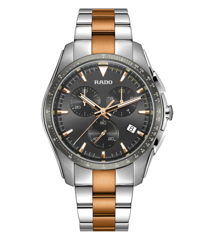 Rado R32259173 Hyperchrome Chronograph Watch for Men Online. This 45 mm HyperChrome Chronograph with the Rado R312 quartz movement inside comes with a dark grey dial, which perfectly matches the 3-row polished stainless steel bracelet with rose gold coloured brushed middle links. The rose gold coloured hands and indexes with white Super-LumiNova® ensure excellent visibility. The case is made of polished and brushed stainless steel whereas the bezel with engraved tachymeter is made of polished plasma high-tech ceramic. The watch is water resistant down to 100 m.