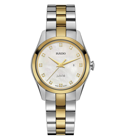 Rado R32975912 Hyperchrome Analog Watch for Women Online. The HyperChrome Quartz features a 30mm polished stainless-steel case and crown and a polished yellow gold coloured Ceramos™ bezel, which matches with the 3-row polished stainless steel bracelet with yellow gold coloured Ceramos™ middle links. The white mother-of-pearl dial with 12 diamonds is covered by a curved sapphire crystal with anti-reflective coating on both sides. The watch has a water resistance of 5 bar. The date is displayed at 3 o’clock.