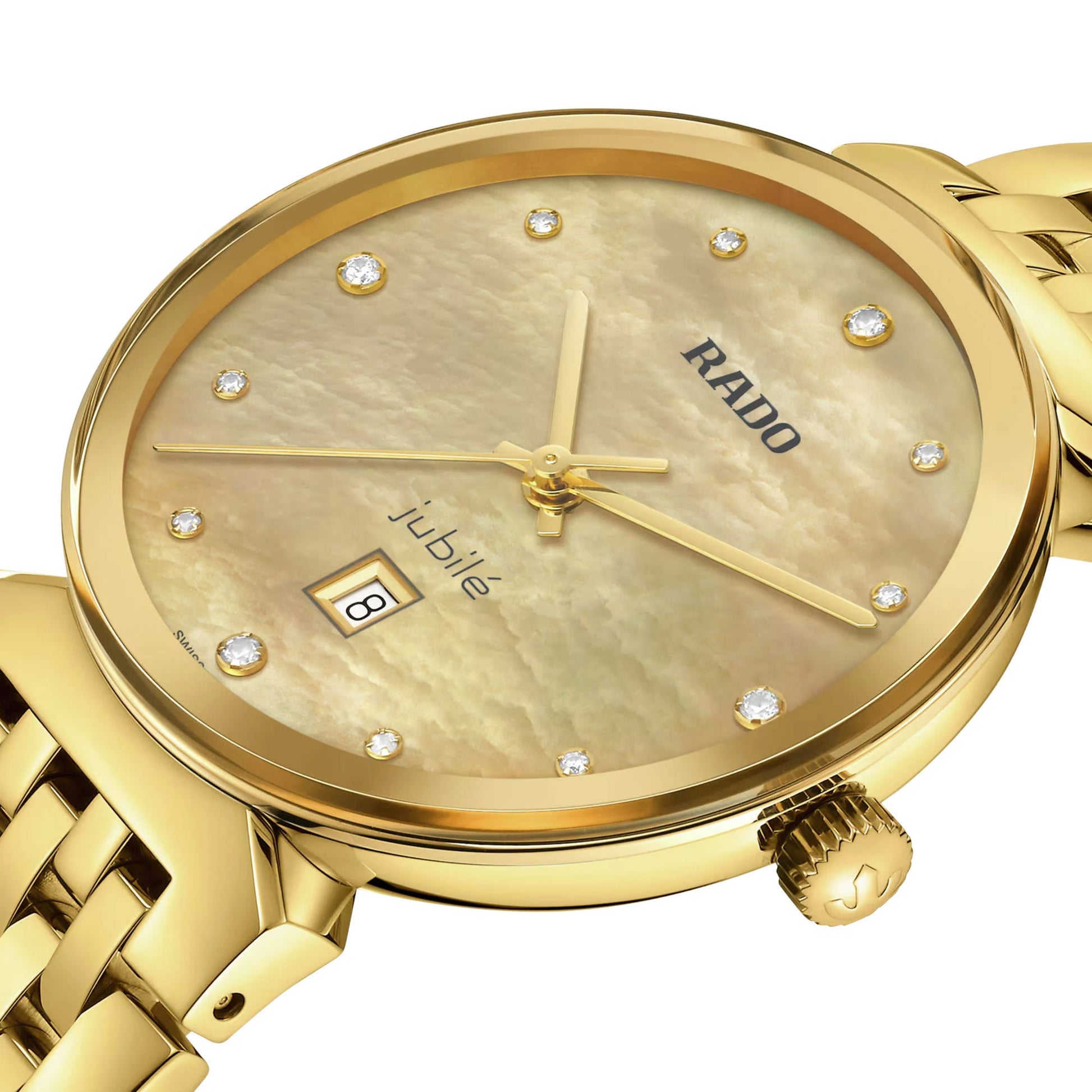 The lustrous mother-of-pearl dial is adorned with 12 shimmering diamonds and the elegant “jubilé” logo, complemented by gold-tone hands for a seamless aesthetic. Finished with a matching gold-tone bracelet and 50 m of water resistance, the Florence is also available in a larger size—making it the perfect pair for timeless style.