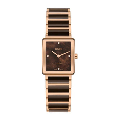 The Rado Integral Diamonds R20251912 redefines timeless elegance with a modern, luxurious twist. Its four-diamond dial and rose gold accents instantly convey the iconic Rado Integral design, while the brown mother-of-pearl dial adds depth, warmth, and a unique character. Encased in slim stainless steel with polished rose gold PVD coating, the watch pairs seamlessly with a bracelet of stainless steel and rose gold PVD, accented by lustrous brown high-tech ceramic links. The curved, edge-to-edge sapphire crystal with anti-reflective coating ensures clarity and durability, while rose gold-coloured details frame the dial with refined grace. Powered by the precise Rado R209 Swiss quartz movement, this two-hand timepiece combines comfort, accuracy, and understated sophistication for women who appreciate style that endures.