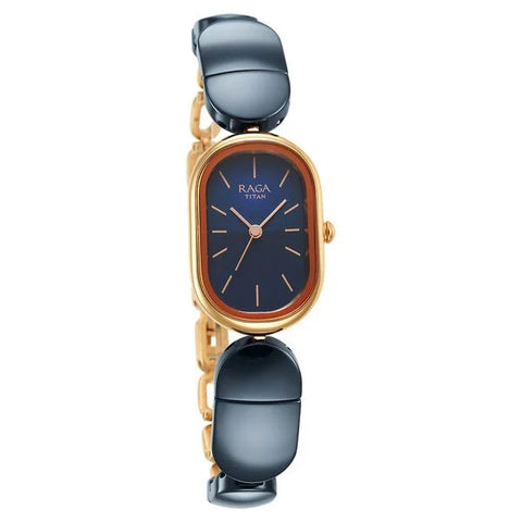 Redefine everyday elegance with this women's analog watch from Titan's Raga Ceramics collection. The distinctive oval blue dial, housed in a sleek 20 mm case, captures attention with its graceful charm. Crafted with a striking blue ceramic bracelet, this timepiece blends artistic design with modern sophistication. Powered by a precise quartz movement and featuring a classic three-hand display, it ensures punctuality with poise. Finished with a secure jewellery clasp, this watch is the perfect accessory to elevate your style with subtle confidence.
