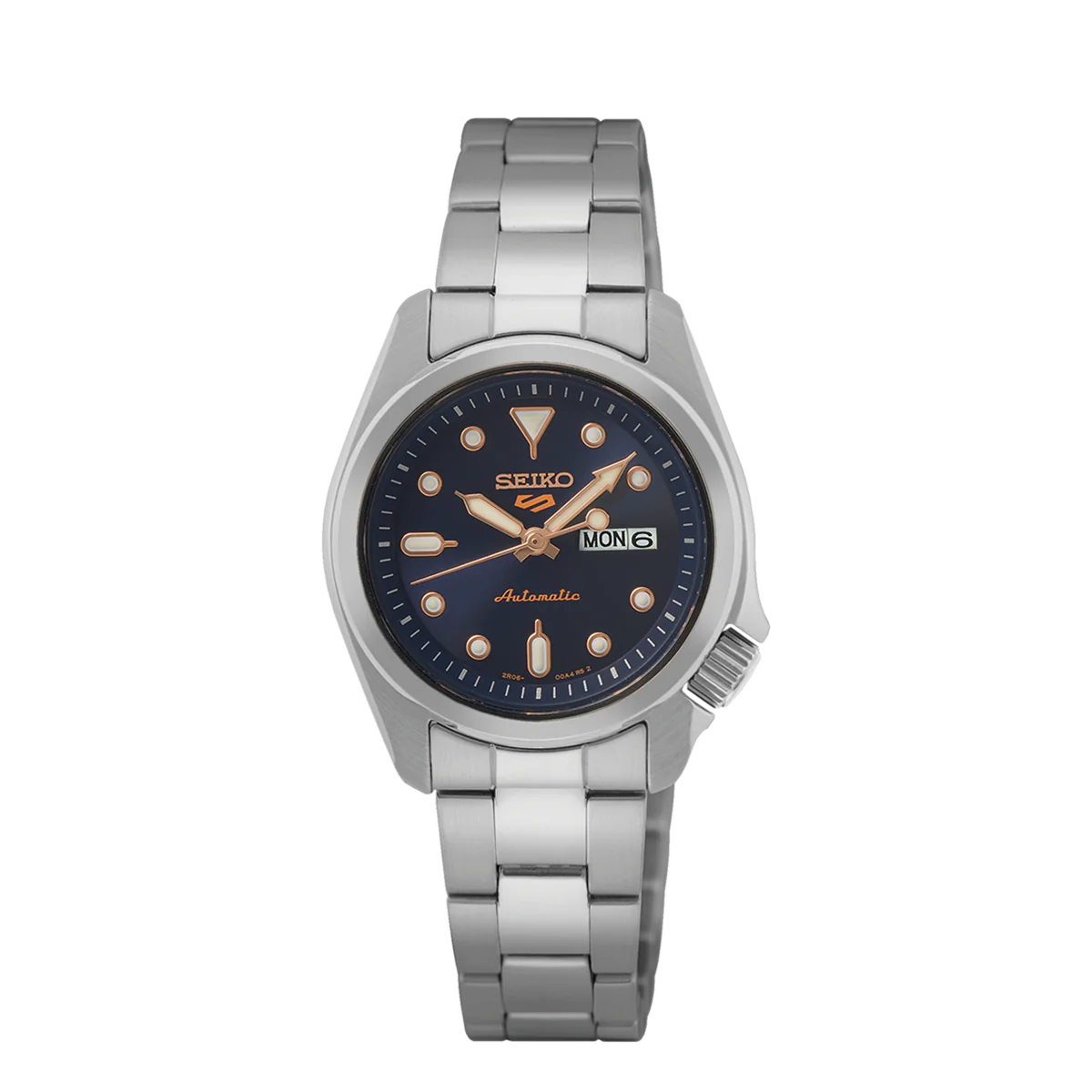 Seiko 5 Sports brings smaller, genderless designs with timeless style. Known for over 50 years of reliability, durability, and performance, these watches maintain the original five key features: Automatic movement, Day-date display, Water resistance, Recessed crown, and Durable case and bracelet.