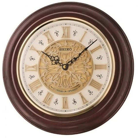 Seiko Wall Clock Oak Wood Musical with Ornamental Dial and Roman Numerals QXM342BN