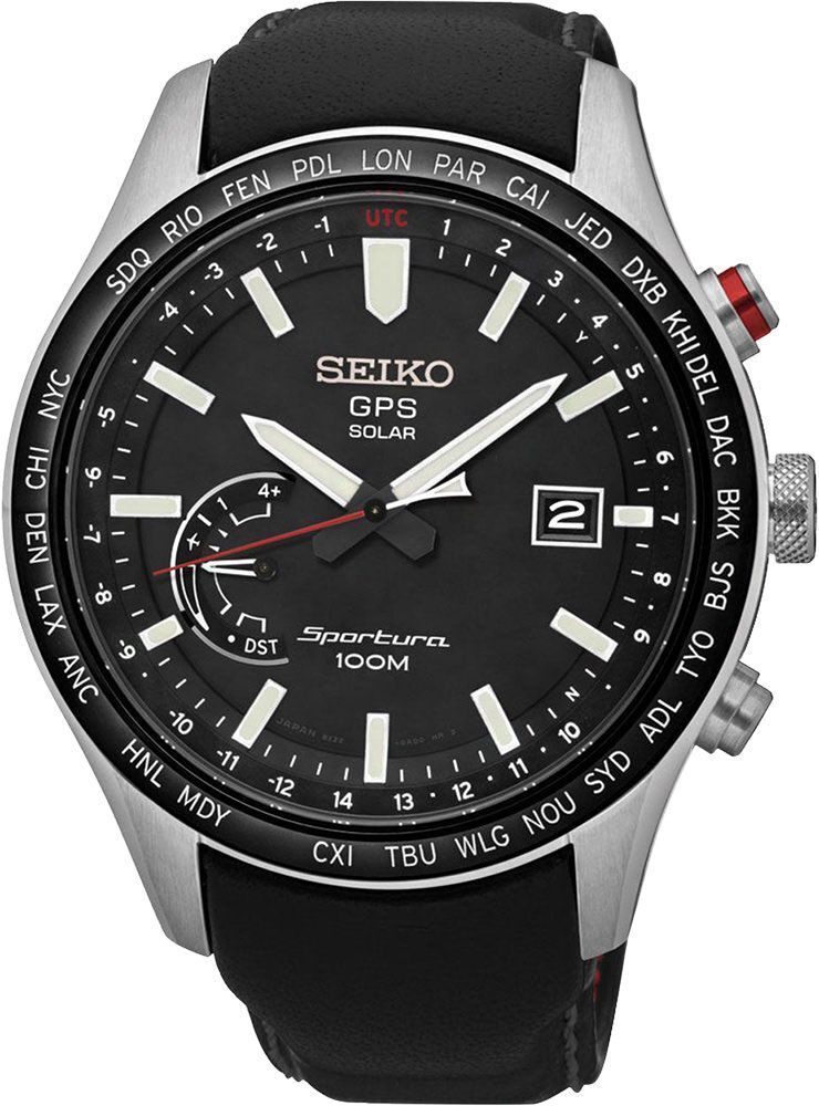 Elevate your style with the Seiko Sportura, featuring a sleek black dial, GPS Solar-powered movement, and perpetual calendar. Crafted with a stainless steel case and sapphire crystal, it offers 100m water resistance and world-time functionality for 40+ time zones. A sophisticated and practical choice for modern men.