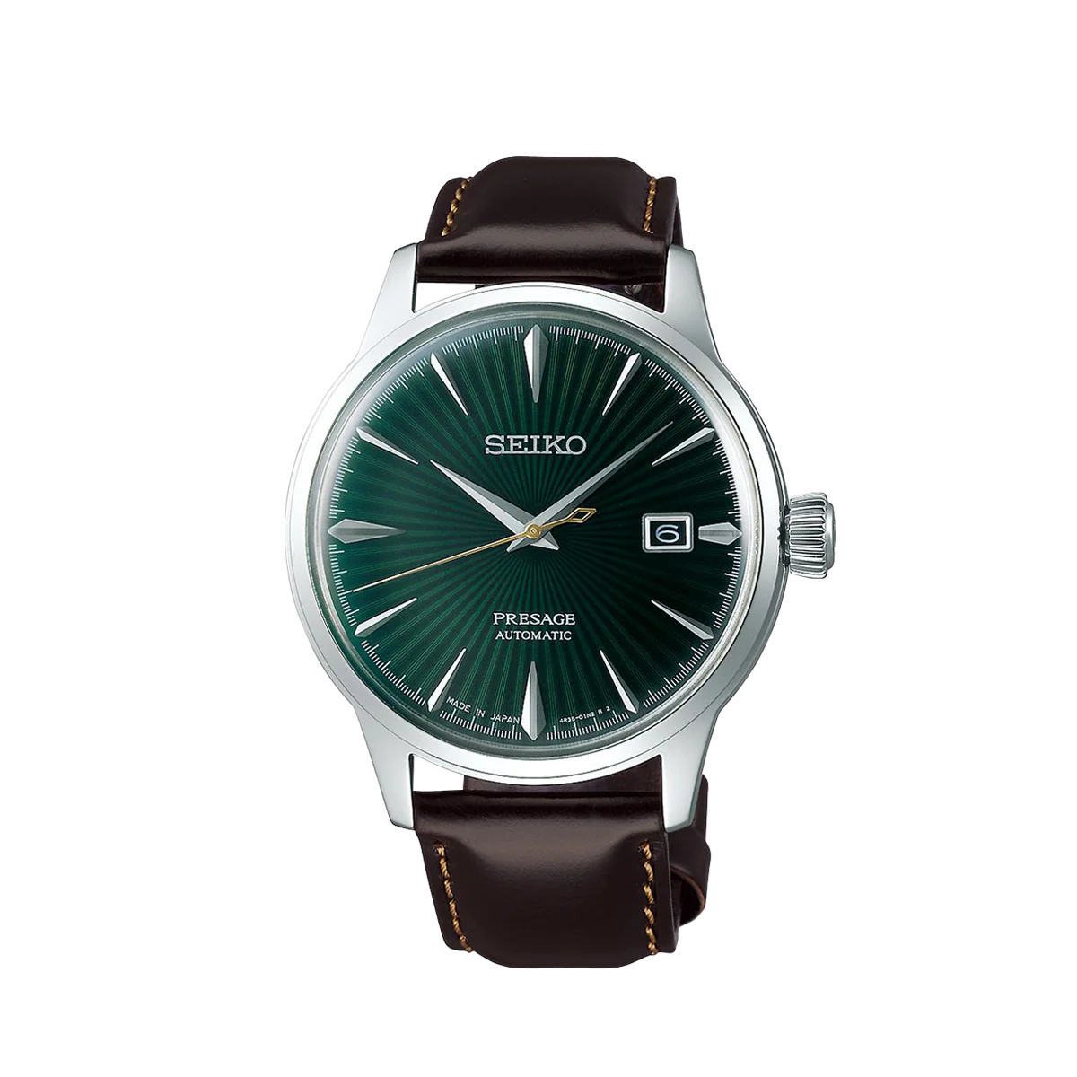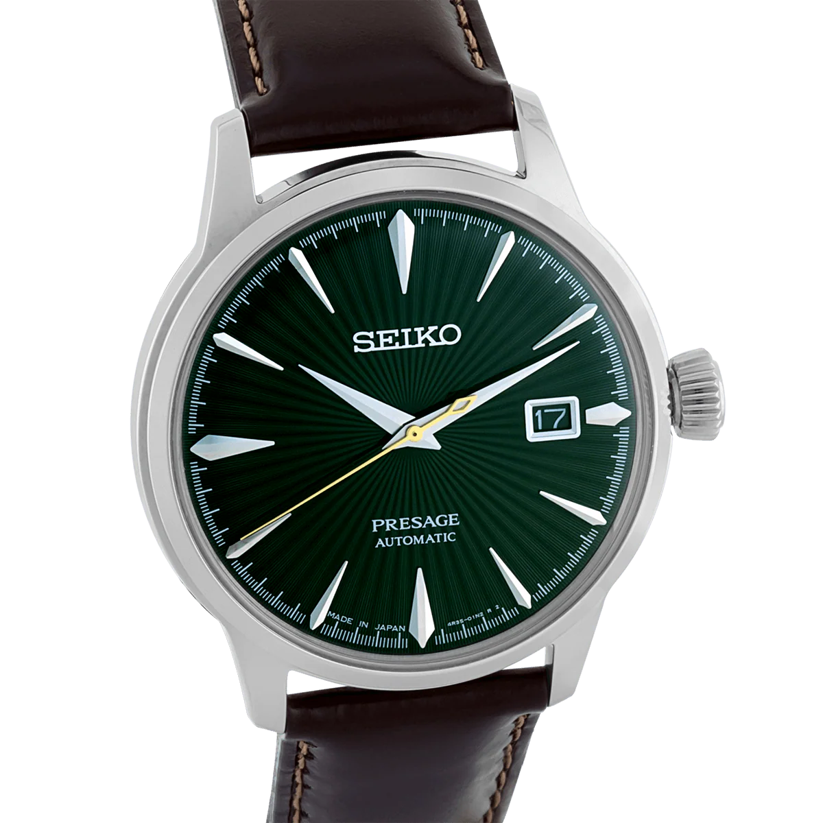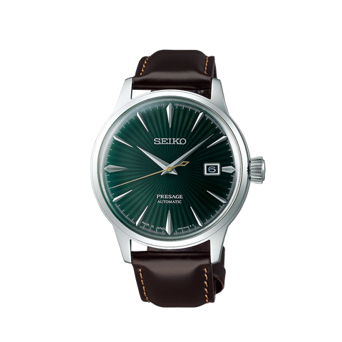 Seiko SRPD37J1 PRESAGE AUTOMATIC WATCH Online. The cocktail collection from Presage comprises watches defined by fine details characterisitic of some of the most tantalising cocktails. From deep and rich tones to mysterious shades, the watches are designed to add a spark of unparalleled style. This green-dial mechanical watch is amongst the ones included in this collection. The watch is complete with a date display, LumiBrite hands and indices, and more.