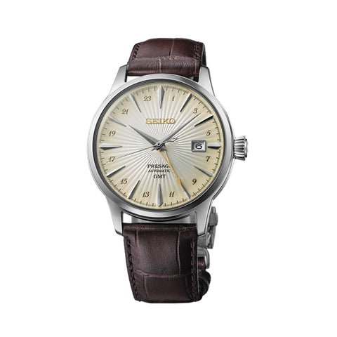 The Seiko Presage 'Rusty Nail' Cocktail Time GMT - SSK041J1 is a sophisticated timepiece inspired by the classic 'Rusty Nail' cocktail. Featuring a rich, sunburst brown dial, this watch blends Seiko's renowned craftsmanship with an elegant design. The GMT function makes it perfect for travelers, while the polished stainless steel case and bracelet add a touch of luxury. Ideal for both formal occasions and everyday wear, this watch stands out for its style and functionality.