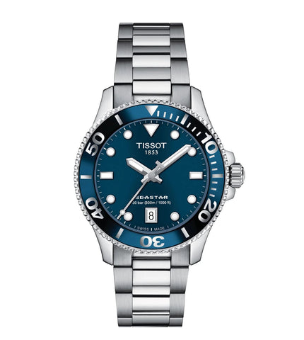 This sleek and stylish Seastar watch from Tissot is just what you need for a stellar and sensible routine. Its profile ticks every box for a high-performance watch with an automatic caliber. Team it up with your best attire and a smart pair of shoes to fetch compliments. Length - 36.00, width - 36.00, thickness - 9.67, lugs - 18.00, energy - Quartz, battery type Renata 371.