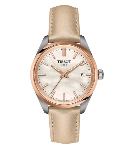 Add a stylish dimension to your look by wearing this unisex's analog watch watch from Tissot. The white MOP round dial is protected by a sapphire glass. It has a crown for time adjustment. The leather strap comes in a cream hue that further elevates the look of the timekeeper. Besides, it is completed with a buckle clasp to ensure a secure fit on the wrist.