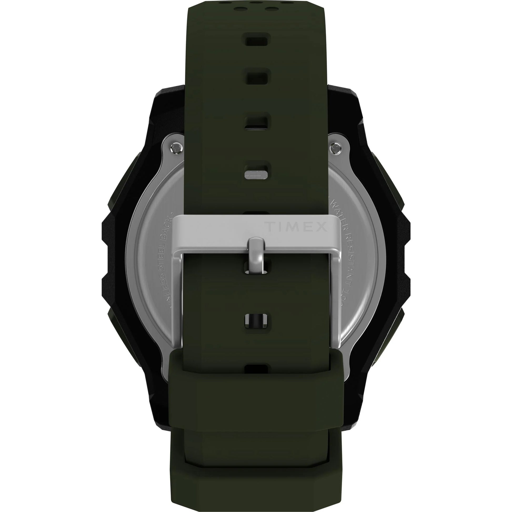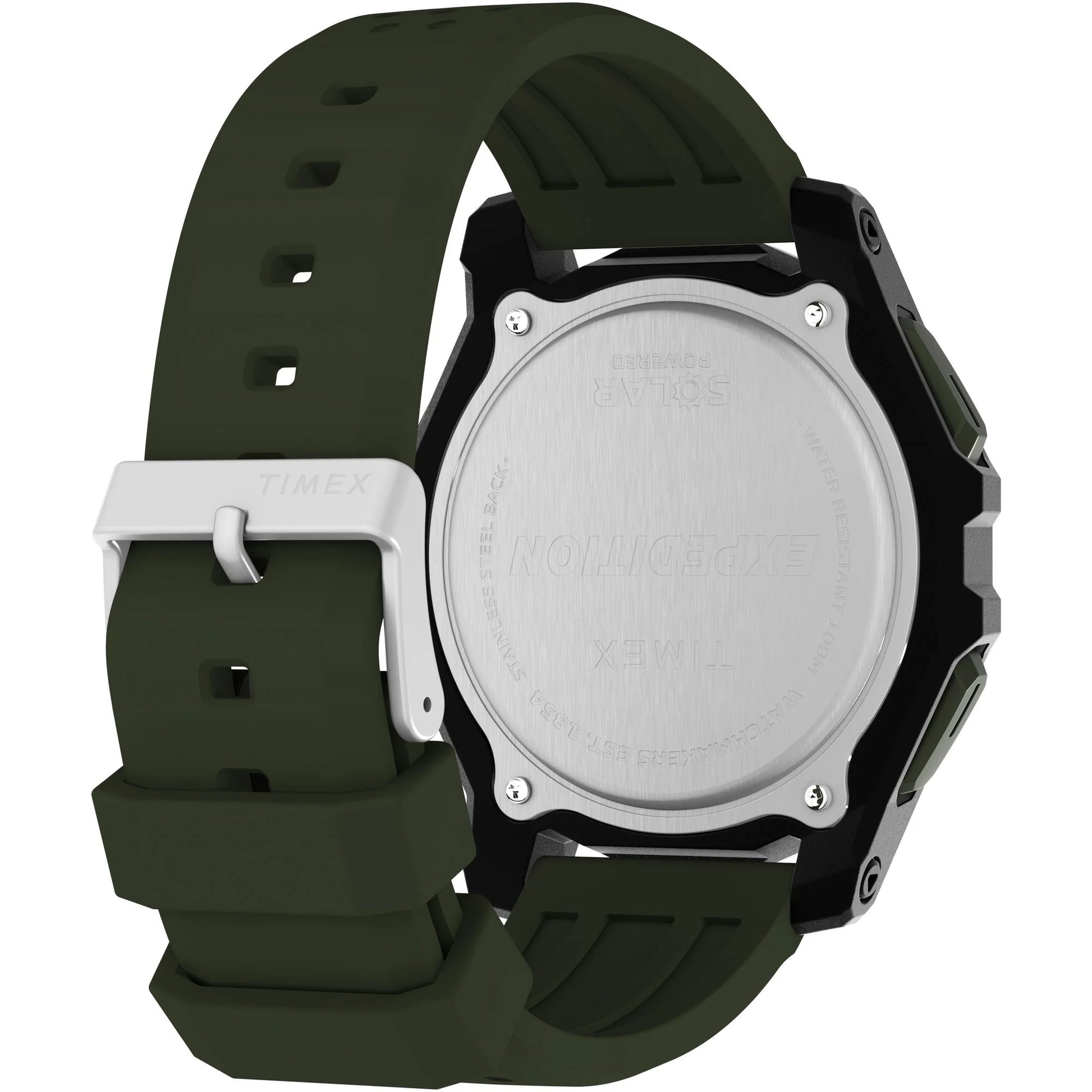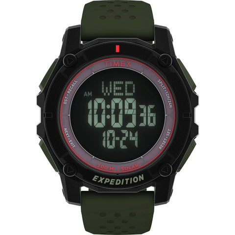 Gear up for your next adventure with this high-performance digital outdoor watch, built to withstand the elements. Featuring a solar-powered battery that charges from any light source, it’s designed for those who need reliability on the go. With a durable 49mm resin case, the watch includes advanced features such as a 1/100th second chronograph, three daily alarms, and a 24-hour countdown timer. The INDIGLO® backlight ensures visibility in low-light conditions, while the world time function tracks 50 cities worldwide. Rated for 100 meters of water resistance, this watch is ready for any terrain. The green textured silicone strap provides a comfortable fit, making it the ideal companion for all your outdoor pursuits.