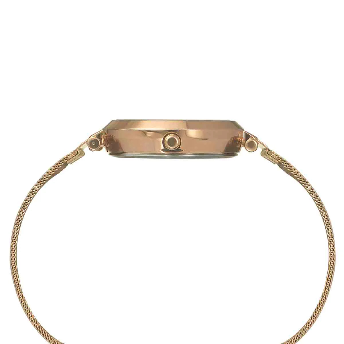 Elevate your style with this elegant 34mm women's fashion watch. Featuring a sophisticated rose gold mesh band bracelet, this timepiece effortlessly combines modern flair with classic charm. The sleek silver dial adds a touch of timeless beauty, making it the perfect accessory for any occasion. Whether for everyday wear or a special event, this watch offers a refined look that enhances your wrist with grace and poise.