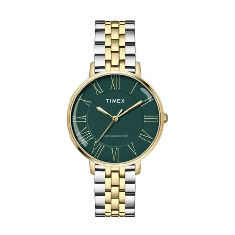 Elevate your wristwear with the Timex TWEL19107, a stunning two-tone women’s watch that blends timeless charm with a touch of bold sophistication. Its rich green dial, adorned with classic Roman numeral markers, offers a luxurious contrast against the gold and silver-toned case and bracelet — making it a true standout accessory. Perfectly balanced between traditional design and modern flair, this watch is ideal for the woman who appreciates detail, elegance, and versatility. Whether you're dressing for the office or an evening out, the TWEL19107 adds just the right amount of shine and sophistication.