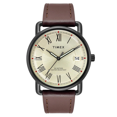 Complete your style with the perfect accessory — this men's analog watch by Timex. Featuring a sophisticated gold round dial encased in a 43mm case, it’s protected by durable mineral glass to keep it looking pristine. Powered by a precise quartz movement, the watch showcases plain three-hand functionality for effortless timekeeping. The brown leather strap adds a touch of elegance, complementing the gold dial for a refined look. Finished with a buckle clasp, it ensures a secure and comfortable fit on your wrist, making it the ideal finishing touch to any outfit.