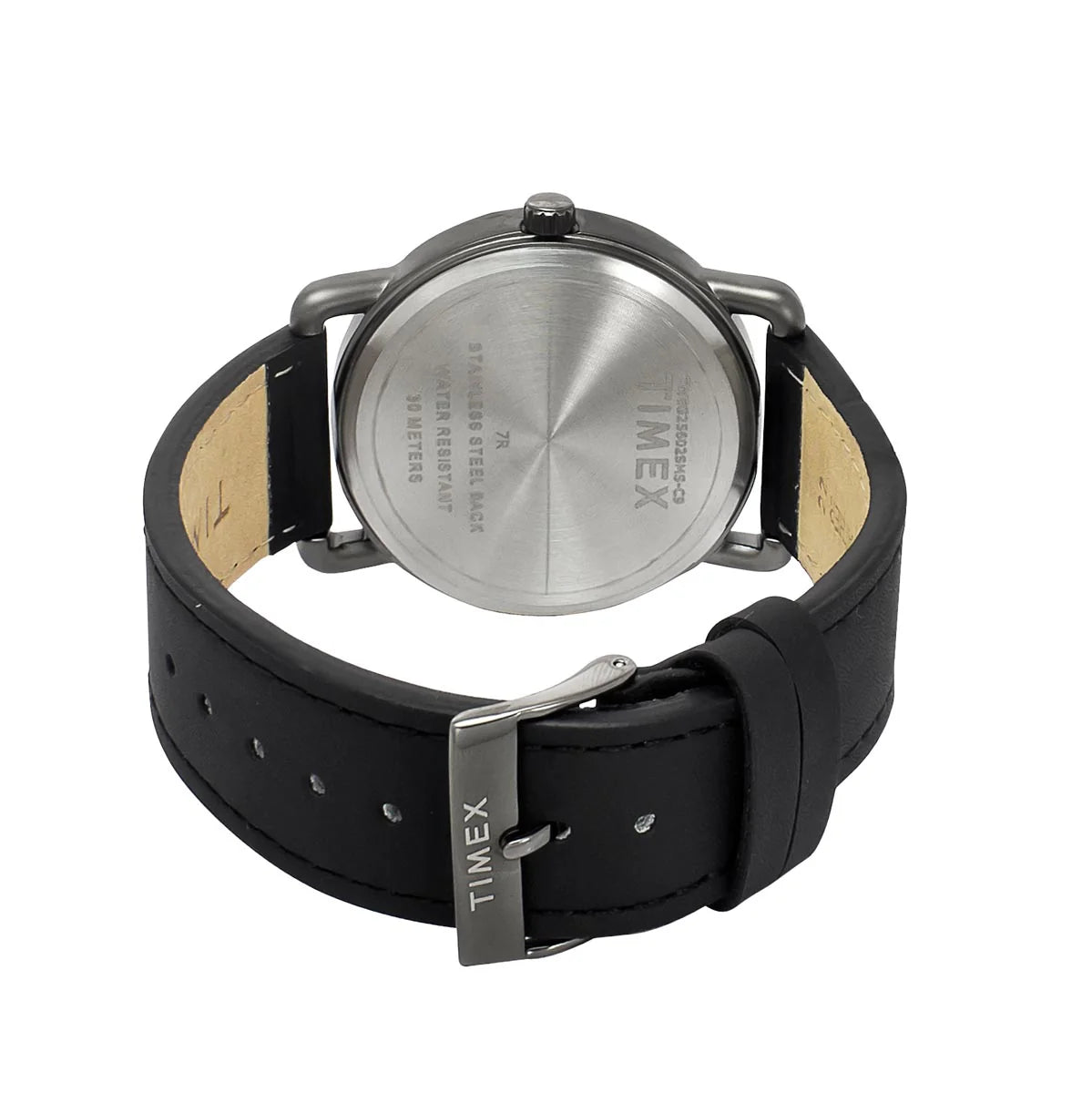 Elevate your style with this men's analog watch by Timex. Featuring a sleek green round dial encased in a durable 43mm case, it is protected by a sturdy mineral glass for lasting clarity. The watch showcases plain three hands for simple yet effective timekeeping. Its black leather strap adds a sophisticated touch, perfectly complementing the overall design. Finished with a buckle clasp, this watch ensures a secure and comfortable fit, making it the perfect accessory for any occasion.