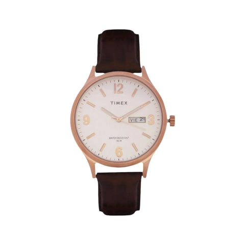 Elevate your style with this men's analog watch from Timex, designed to complement both casual and formal outfits. The sleek white round dial displays plain three hands and a convenient date function, with a crown for precise time adjustments. The brown genuine leather strap adds a touch of sophistication, perfectly accentuating the watch's timeless appeal. Finished with a sturdy buckle clasp, this watch guarantees a secure and comfortable fit all day long.