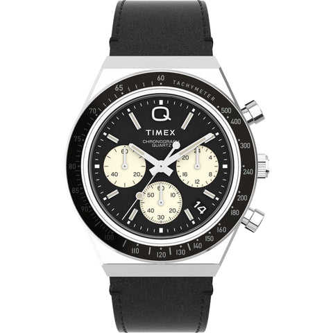 Take the lead with the Q Timex Chronograph, a high-performance timepiece inspired by the iconic motoring watches that dominated Europe’s legendary race tracks. A tribute to the groundbreaking 1970s Q Timex, this watch boasts an ultra-precise chronograph movement and a black tachymeter bezel, echoing the precision and functionality of a true racing watch. With the ability to measure elapsed time and average speed, it’s designed for the ultimate daredevil. The striking jet-black dial features contrasting sub-dials, a date function, and hand-applied dimensional indices, all complemented by an updated Q Timex logo. The brushed and polished stainless-steel case and crown add a bold, dynamic edge to the retro-inspired design. Finished with a black leather strap and quick-release spring bars, this timepiece offers the perfect balance of style, durability, and race-ready flair. Whether on the road or off, the Q Timex Chronograph is always ready to perform.