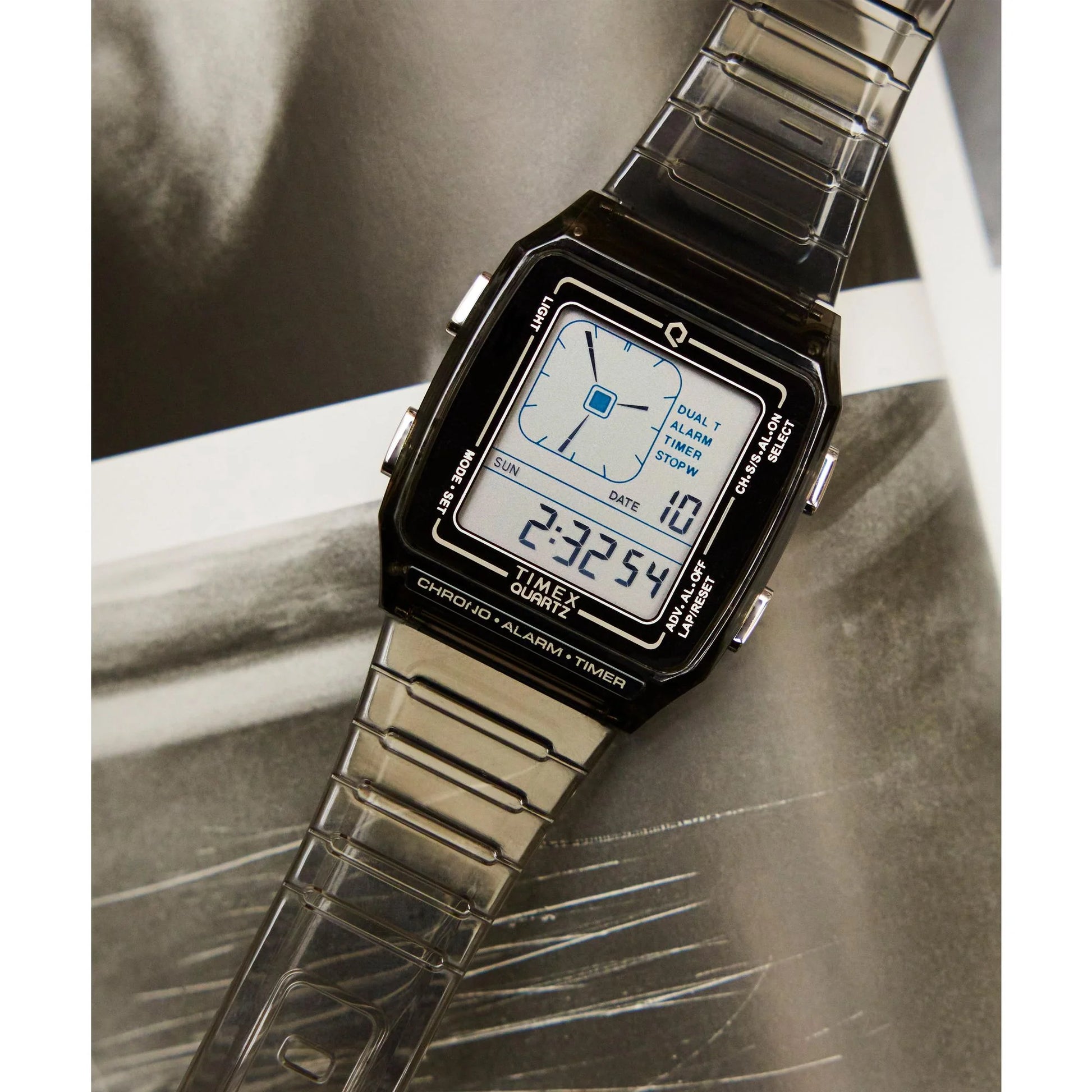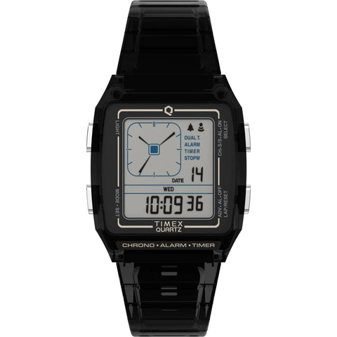 Taking a trip down memory lane, we’ve resurrected a digital classic from the late '80s with a modern twist. The Q Timex® Digital LCA (Liquid Crystal Analog) perfectly blends retro charm with today’s style. Reimagining the original design, this timepiece combines a unique digital/analog display with a sleek, translucent grey resin case and matching strap. Featuring a nostalgic pre-INDIGLO® single-bulb backlight, it keeps that vintage feel alive while offering a contemporary fit. Just as functional, stylish, and comfortable as it was more than four decades ago, this watch is the perfect blend of the past and present.