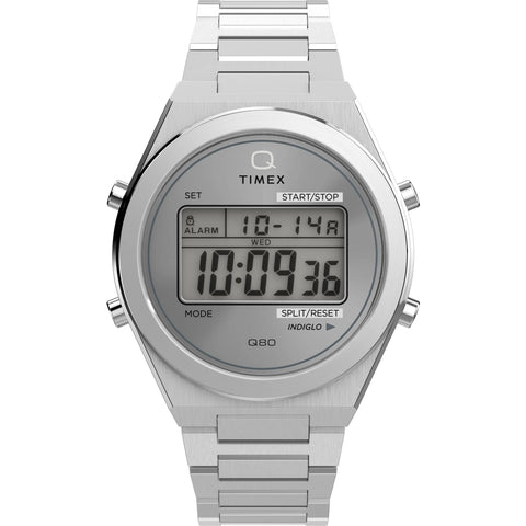 Inspired by the bold aesthetics and luxurious vibe of West Hollywood, the Timex Q80 reinvents our classic Q Timex® with a sleek, modern twist. Featuring a striking round case and a rectangular digital display, this watch is framed by sunburst brushing that radiates timeless sophistication. With the same dependable features as the iconic T80, including the signature INDIGLO® backlight for easy readability during late nights, the Q80 is both functional and stylish. Crafted from a gold-tone or silver-tone 39mm brushed stainless-steel case with polished edges, it’s complemented by a matching brushed stainless-steel bracelet. This timepiece seamlessly blends vintage charm with contemporary design, offering the perfect balance of style and utility.