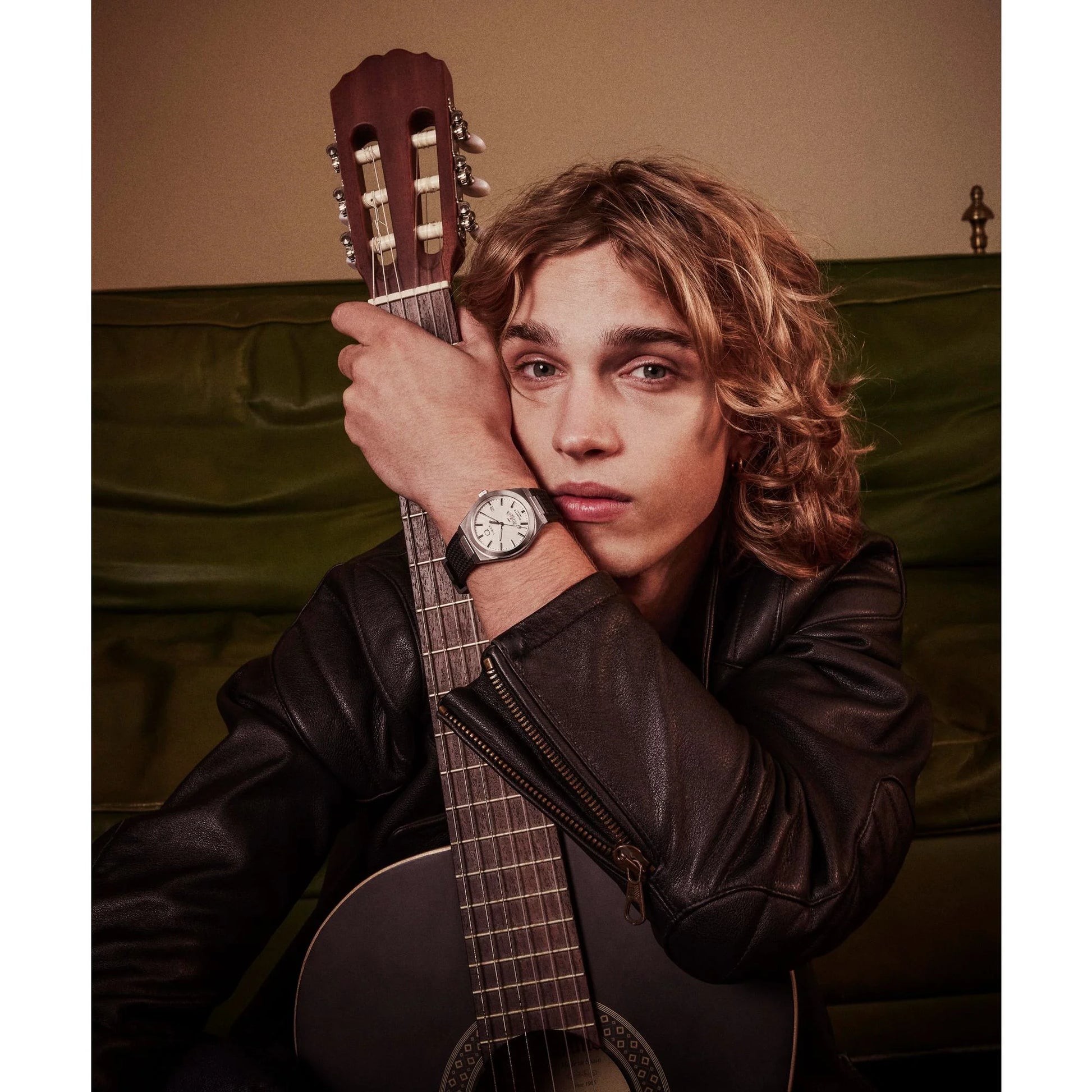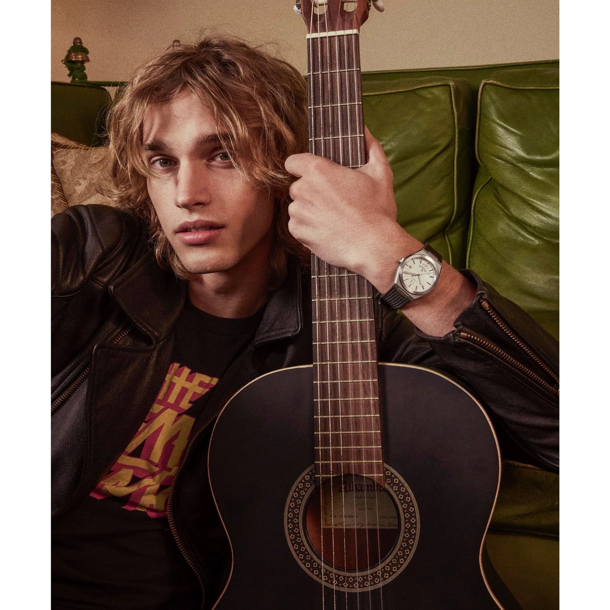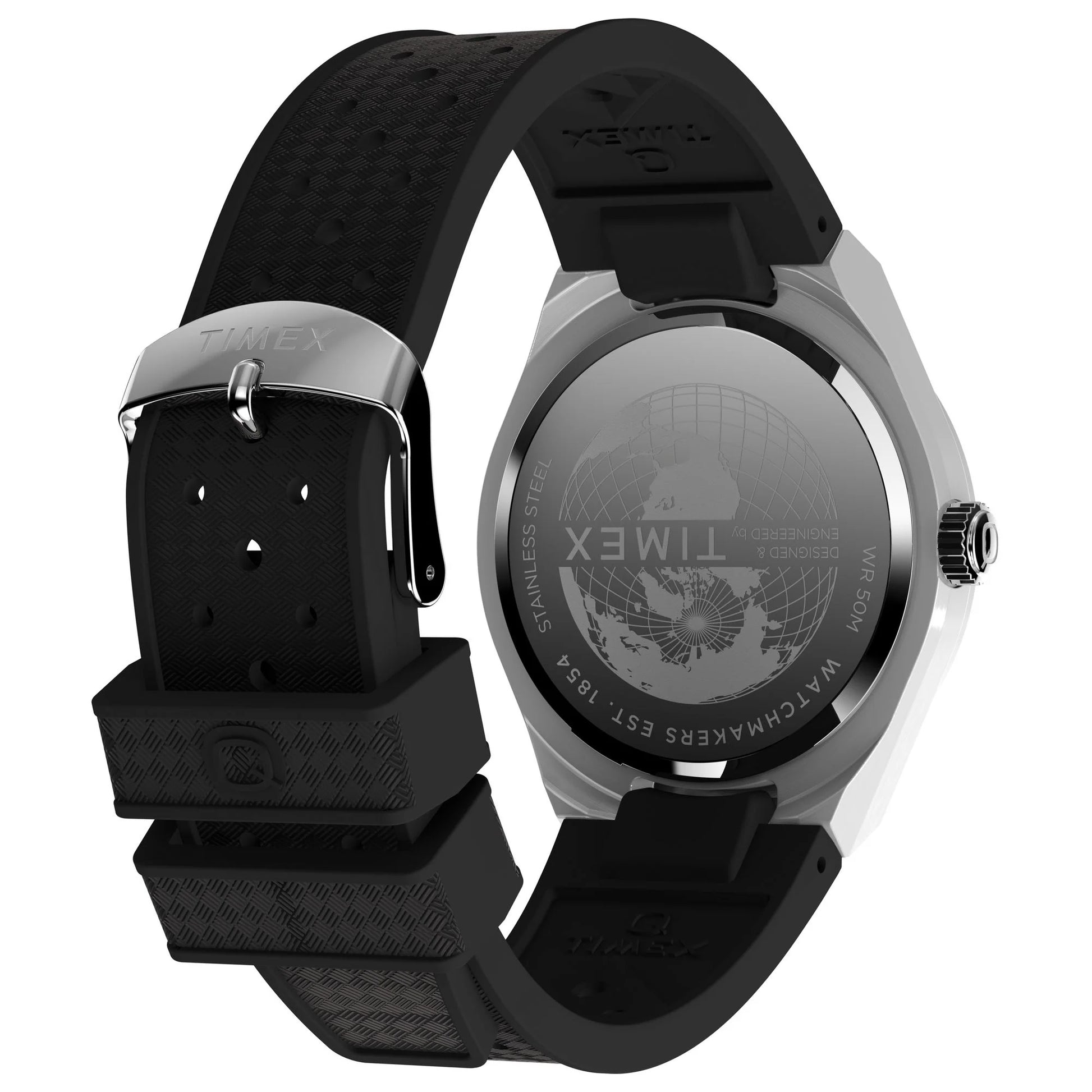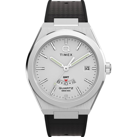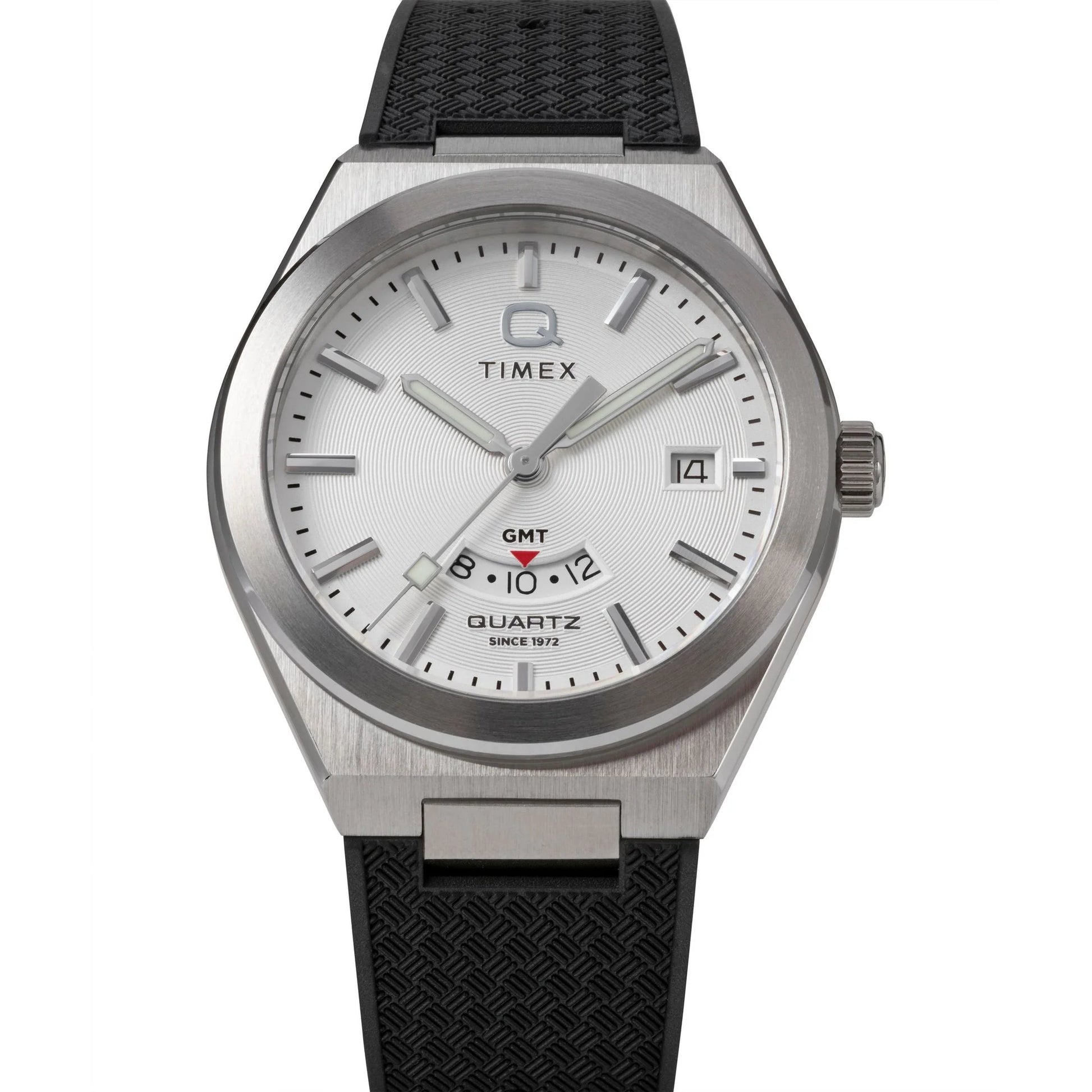 Embodying the bold designs and vibrant glamour of ‘70s West Hollywood, the Q Timex® Continental GMT elevates the iconic Q Timex collection with a refined, modern touch. The sleek 39mm brushed stainless-steel case with polished edges exudes sophistication, while the discreet GMT function at 6 o’clock adds practicality for today’s global traveler. The minimalist black or silver-tone dial features a unique radial texture, faceted hour markers, and luminant hands for easy readability in low light. A date window near the 3 o’clock marker adds a dash of convenience, making this timepiece as functional as it is stylish. The textured black synthetic rubber strap, perforated for a relaxed, casual vibe, completes the look, allowing you to embrace both comfort and elegance as you let the hours slip by.