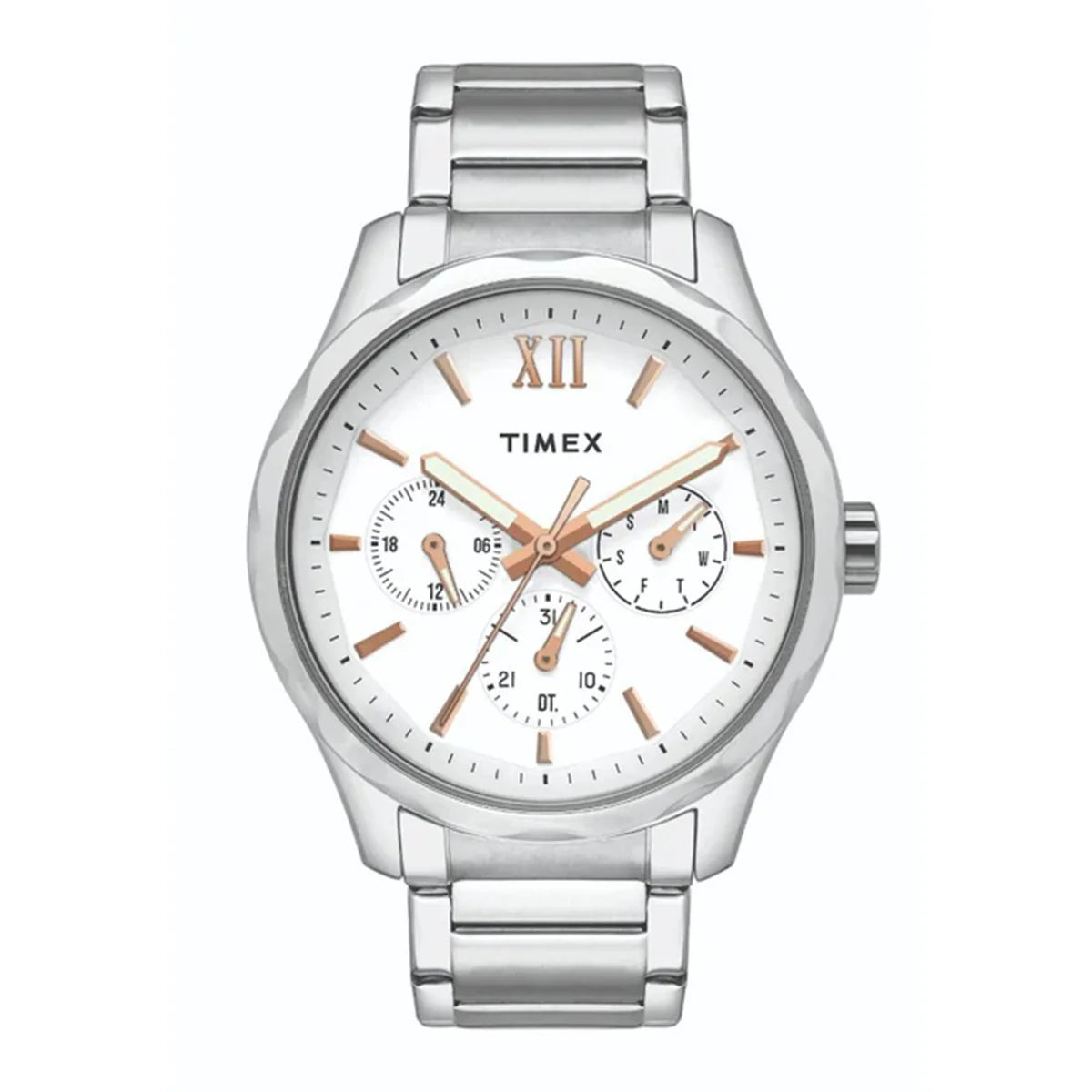 This men’s analog watch from Timex’s Fashion Collection blends modern design with classic appeal. Featuring a sleek silver-toned stainless steel strap, it brings a refined edge to any ensemble. The crisp white round dial, housed under durable mineral glass, is powered by reliable quartz movement and includes multifunctional sub-dials for added utility. A secure push-button clasp ensures a comfortable and confident fit—perfect for those who appreciate detail, style, and precision.