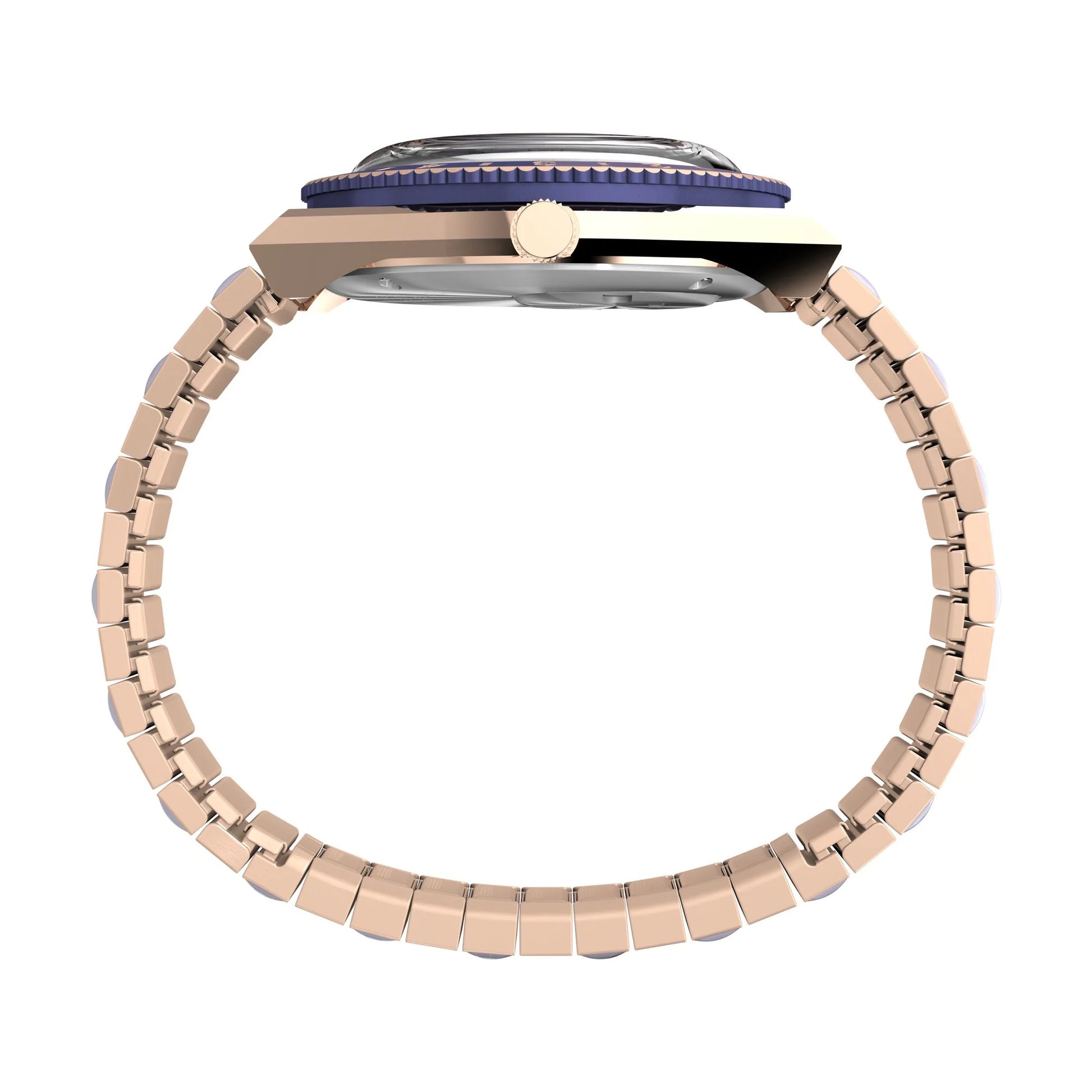 Introducing the refreshed Women’s Q Timex, where classic design meets a modern twist. This timepiece features a delicate pastel color palette, with soft shades of purple gracing the dial, bezel, and the brushed rose gold-tone stainless-steel Perfect Fit expansion band. The dial is complemented by a bidirectional rotating top ring and a day and date window, ensuring both practicality and style. Bold hour markers add contrast, while the domed acrylic crystal gives a sleek finish. This is the perfect blend of functionality and femininity, making it an ideal accessory for any occasion.