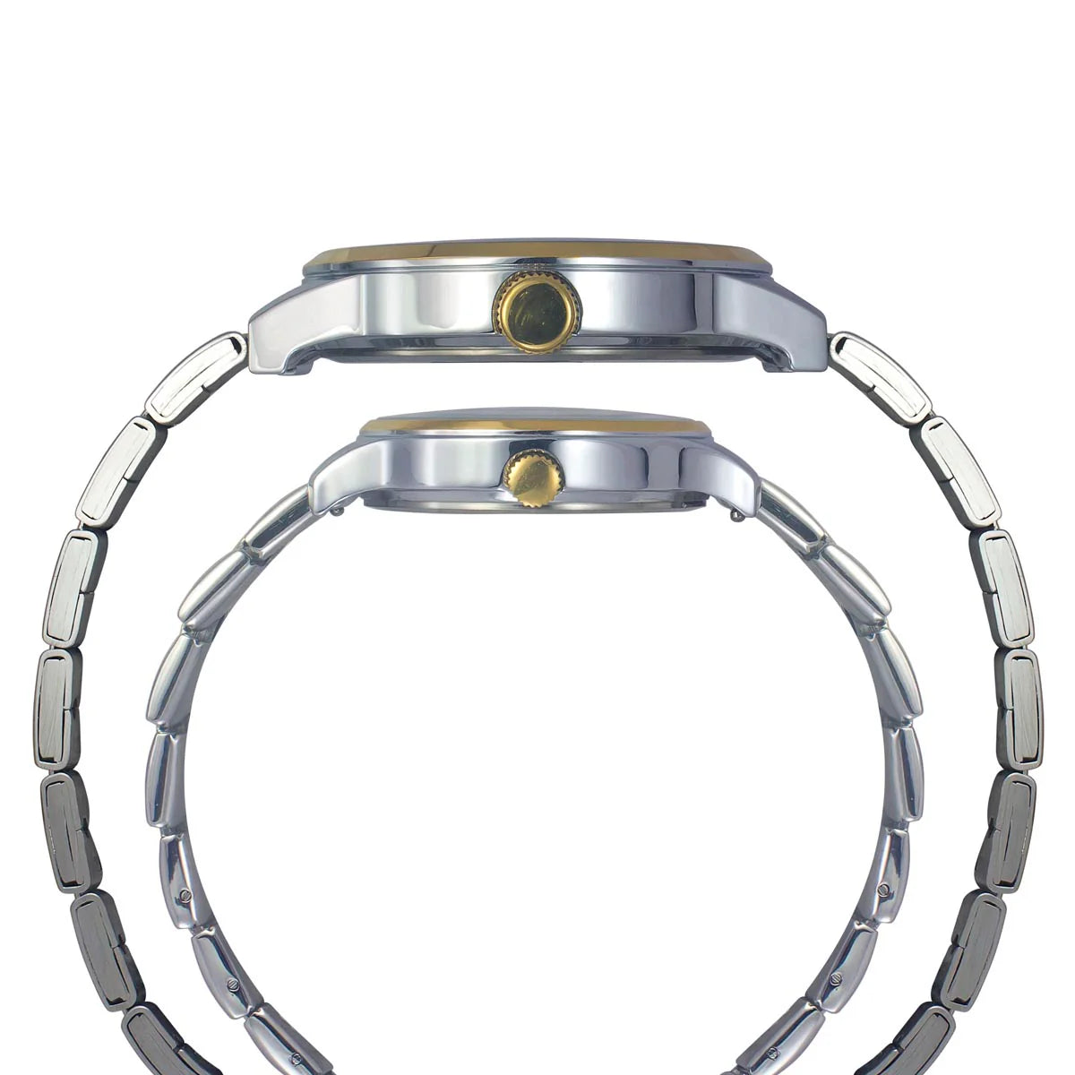 Introducing the Timex Pair Watch, a seamless combination of elegance and practicality for both men and women. These sophisticated timepieces feature a striking teal round dial, paired with a sturdy yet comfortable stainless steel strap. Designed to be versatile, they effortlessly transition from casual to formal settings, making them the perfect accessory for any occasion. The easy-to-read analog display ensures precision, while the timeless design adds a refined touch to any wardrobe. With Timex’s renowned craftsmanship, these watches deliver reliability and sophistication, making every moment a statement of style.