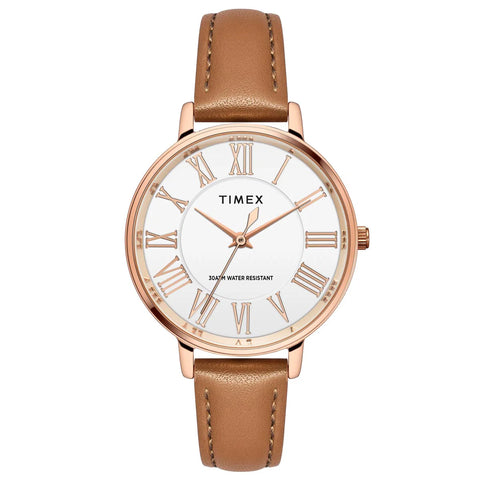 Exuding timeless elegance, this women's analog watch by Timex is the perfect blend of style and sophistication. The tan leather strap adds a warm, classic touch, elevating the overall design. The silver round dial, protected by durable mineral glass, is encased in a 34 mm case, showcasing simple yet elegant three-hand movement. Finished with a buckle clasp, this watch offers a secure and comfortable fit, making it a versatile accessory for both everyday wear and special occasions.
