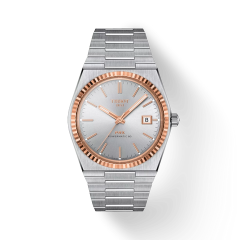 Inspired by a groundbreaking design first introduced in 1978, the Tissot PRX embodies the perfect balance between vintage character and modern innovation. The original model stood out with its slim profile, narrow hour markers, and integrated steel bracelet, seamlessly flowing into a flat tonneau-shaped case with distinctive horizontal lugs. These iconic design codes remain at the heart of today’s PRX, enhanced by exceptional ergonomics that offer remarkable flexibility, comfort, and wearability. The PRX Powermatic 80 steel & 18-carat gold elevates this heritage with refined finishing—combining satin-brushed surfaces on the exterior with polished inner details for a sophisticated contrast. Super-LumiNova® coated hands sit close to the crystal, creating a striking optical illusion that makes the case appear even slimmer and more streamlined. Protected by a scratch-resistant sapphire crystal with anti-reflective coating on both sides, the dial remains clear and legible in all conditions. At its core beats a Swiss Made automatic Powermatic 80 movement, delivering an impressive power reserve of up to 80 hours. Enhanced by a Nivachron balance spring, it offers outstanding resistance to magnetic fields, ensuring long-term precision and reliability. The Tissot PRX Powermatic 80 steel & 18-carat gold is a masterful fusion of comfort, craftsmanship, and timeless design—created for those who appreciate both heritage and performance.