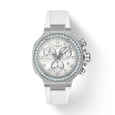 Fueled by a high-precision quartz chronograph movement, the Tissot T-Race 38mm captures the exhilarating spirit of speed and freedom. Compact yet assertive, its 38mm case introduces a bold new expression of the T-Race’s dynamic design language—built for those who live life in motion. Inspired by Tissot’s partnership with motorcycle racing, this timepiece channels the raw energy and mechanics of the sport. Every element pays homage to motorcycling heritage: the bezel mirrors a brake disc adorned with glass ceramic, the pushers echo the form of handlebars, and the case sides recall the cooling fins of a powerful engine. Crafted from durable 316L stainless steel and protected by a scratch-resistant, anti-reflective sapphire crystal, the T-Race delivers both endurance and clarity. Water-resistant up to 10 bar (100 m), this chronograph combines precision timing with unmistakable racing DNA—a perfect fusion of performance, design, and passion.