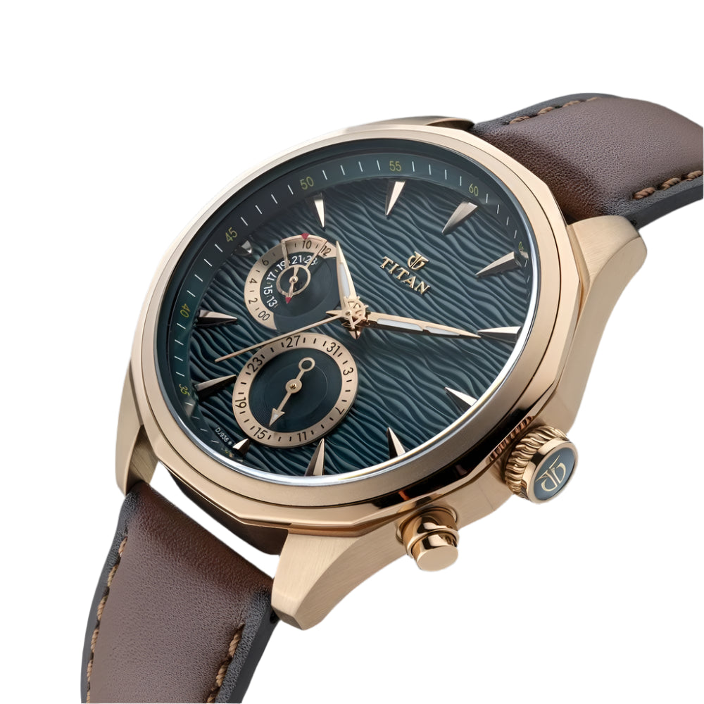 Sail through your day in style with this striking timepiece from Titan’s Maritime collection. Designed for men who appreciate bold elegance, it features a captivating sea green dial with a 3D wave pattern that evokes the spirit of the ocean. Housed in a substantial 49 mm case and protected by durable mineral glass, the dial showcases boat-shaped indices, dual subdials, and sleek three-hand functionality. A dark tan genuine leather strap adds a refined contrast, secured with a classic buckle clasp for all-day comfort. Powered by reliable quartz movement, this watch is a perfect blend of nautical charm and modern sophistication.