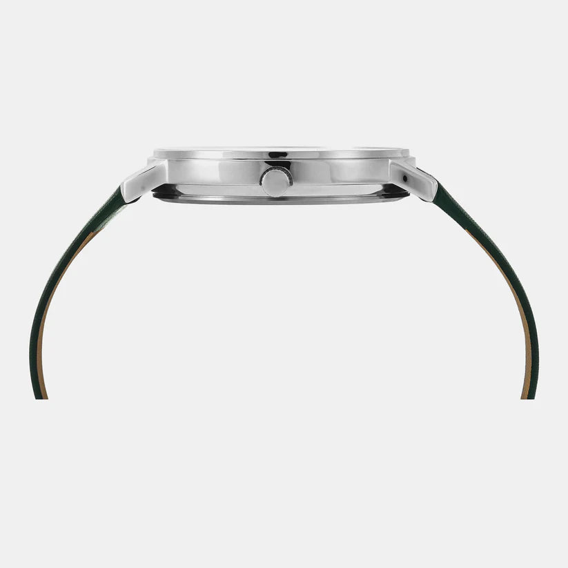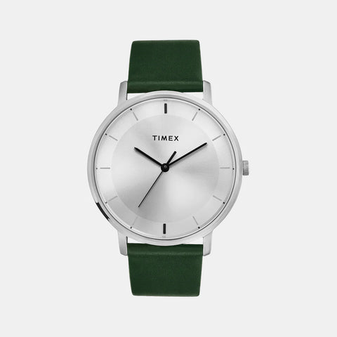 Bring a fresh touch to your wrist with this men's analog stainless steel watch, designed to make a subtle yet stylish statement. The 41mm round case frames a sleek silver dial, while the reliable quartz movement ensures precise timekeeping. The vibrant 19mm green leather strap adds a pop of color, secured with a classic tang buckle for a comfortable fit. With 3 ATM water resistance, it's perfect for casual wear, and its lightweight design at just 40 grams makes it an effortless accessory. The slim 8mm case thickness contributes to its modern appeal. Crafted in India, this watch comes with a 2-year warranty for your peace of mind.