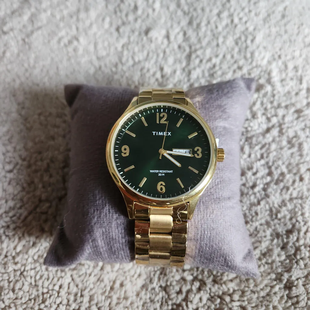 This Timex watch combines a classic champagne dial with a sturdy stainless steel bracelet, making it a stylish and reliable accessory for any occasion.