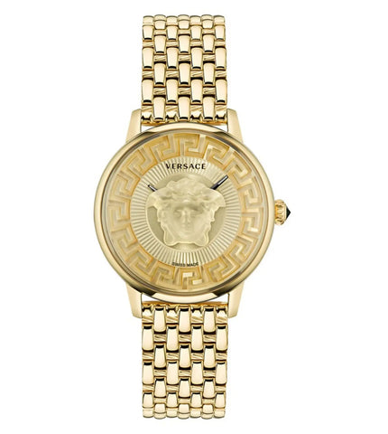 The Versace VE6F00623 Round Gold Dial Watch is a statement of luxury and elegance. Featuring a stunning gold-tone dial and Versace's signature Medusa logo at 12 o'clock, this women's watch is designed to exude sophistication. The gold-tone stainless steel case and sleek bracelet make it a perfect accessory for both formal and casual occasions. A refined choice for women who appreciate timeless style.