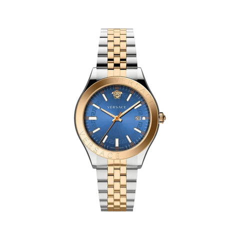 The Versace Hellenium-VK 42 mm showcases a striking blue dial that delivers precise analog timekeeping with a bold yet refined presence. Designed for the modern man, its perfectly proportioned 42 mm case offers a seamless balance of style and comfort. Subtle detailing and a clean aesthetic make this timepiece effortlessly versatile, elevating both formal attire and everyday looks with a touch of understated luxury.