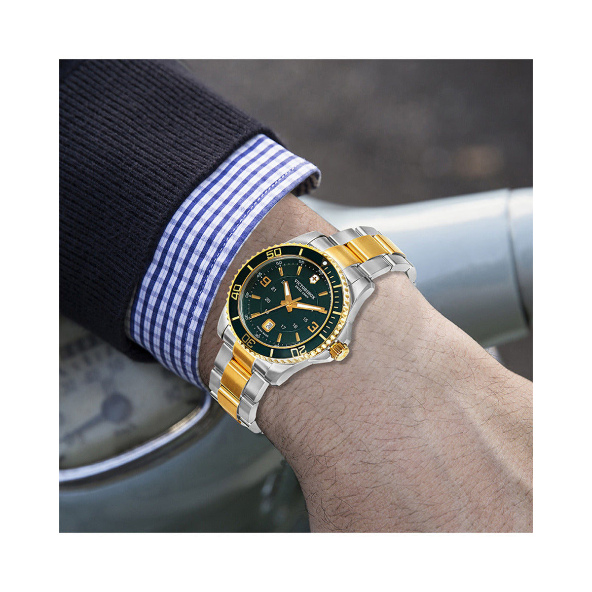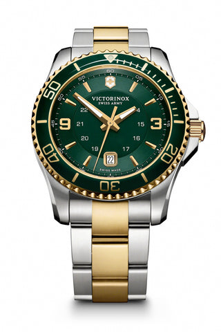 This Swiss-engineered timepiece showcases a robust 43mm stainless steel case, paired with a rich green dial that strikes the perfect balance between boldness and refinement. Its two-tone stainless steel bracelet elevates the design with a hint of luxury, while the unidirectional rotating bezel adds a dynamic, sporty edge. Built for performance, the watch features luminous hands and hour markers for enhanced visibility in the dark, and a scratch-resistant sapphire crystal that guards against everyday wear. With 100 meters of water resistance, the Maverick is as versatile as it is elegant—ready for business meetings, weekend adventures, and everything in between.